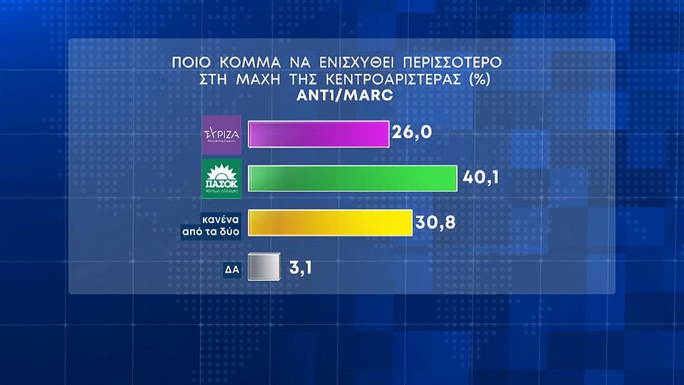 Αίσθηση προκαλεί, επίσης, το εύρημα για τη «μάχη» ΣΥΡΙΖΑ-ΠΑΣΟΚ για την Κεντροαριστερά. Το 40,1% των ερωτηθέντων θέλουν να ενισχυθεί το ΠΑΣΟΚ, έναντι 26% που απαντά το ίδιο για τον ΣΥΡΙΖΑ.