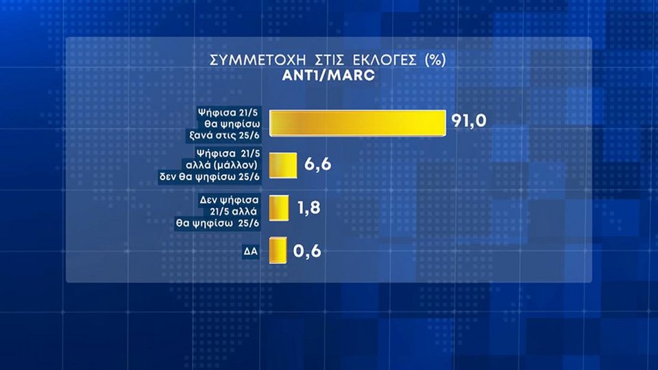 Ενθαρρυντικά είναι τα σημάδια ως προς τη συμμετοχή στις εκλογές της 25ης Ιουνίου, καθώς το 91% που ψήφισε τον Μάιο δηλώνει ότι θα ξαναψηφίσει.