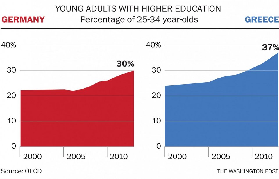 Η Γερμανία μπορεί να έχει ισχυρότερη οικονομία, αλλά αυτό δεν σημαίνει ότι έχει πλεονέκτημα σε ό,τι αφορά τον πιο εκπαιδευμένο πληθυσμό. Ισως επειδή το σύστημα της Γερμανίας είναι πιο επικεντρωμένο στην τοποθέτηση ατόμων σε θέσεις εργασίας από ότι να τους στέλνει στα πανεπιστήμια ανεξάρτητα από τις προοπτικές καριέρας. Αλλά από τους Ελληνες δεν λείπει η εκπαίδευση.