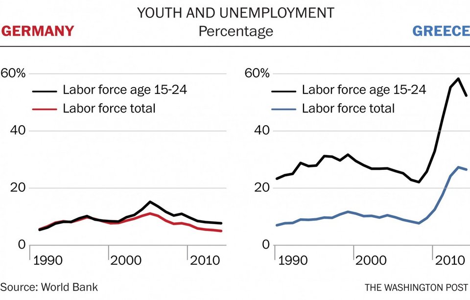 Η Γερμανία δεν έχει απλά μεγαλύτερο πληθυσμού, αλλά είναι και μακράν πιο πλούσια. Είναι η μεγαλύτερη οικονομία στην Ευρώπη. Από την άλλη, σε ό,τι αφορά την Ελλάδα, το κατά κεφαλήν ΑΕΠ της μοιάζει περισσότερο με εκείνο των αναπτυσσόμενων χωρών της ανατολικής Ευρώπης. Τα τελευταία χρόνια η Γερμανία έχει γίνει πιο πλούσια, μετά από δεκαετίες ανάπτυξης, αλλά η Ελλάδα έχει γίνει πιο φτωχή.