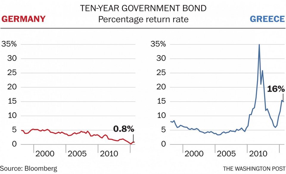 Για το μεγαλύτερο μέρος αυτού του αιώνα, οι γερμανικές και οι ελληνικές κυβερνήσεις έπρεπε να πληρώσουν περίπου τα ίδια για να δανειστούν. Αυτό είναι αξιοσημείωτο για πολλούς λόγους. Η Ελλάδα είχε μεγαλύτερο χρέος, ως ποσοστό του ΑΕΠ, αλλά οι δύο χώρες ήταν μέλη μίας νομισματικής ένωσης και αυτό έδινε στους επενδυτές περίπου ίδια εμπιστοσύνη για το χρέος και των δύο χωρών. Ομως, τα τελευταία χρόνια το χρέος της Ελλάδας διογκώθηκε. Τώρα που αντιμετωπίζει κρίση, πρέπει να πληρώσει πολλά περισσότερα για να δανειστεί. Την ίδια ώρα, οι επενδυτές αντιμετωπίζουν το χρέος της Γερμανίας ως σχεδόν ακίνδυνο.