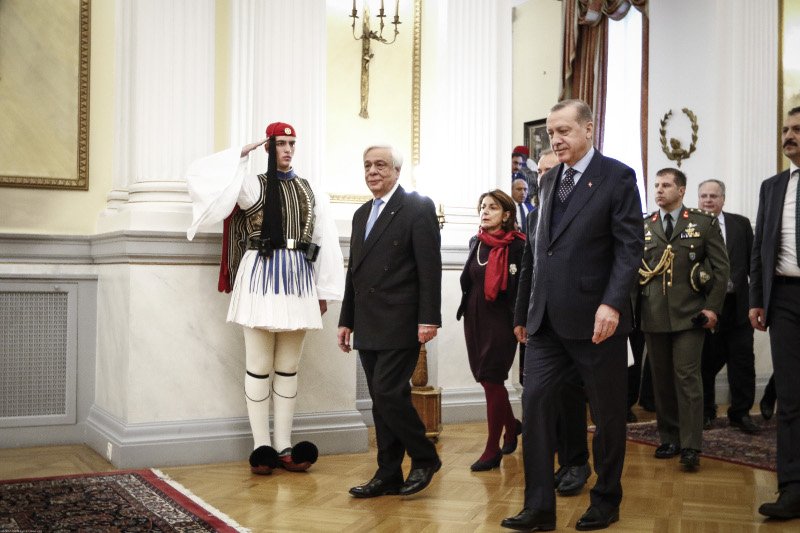 Ο Ταγίπ Ερντογάν έφτασε στο Προεδρικό Μέγαρο στις 11:45 π.μ., όπου έγινε δεκτός από τον Πρόεδρο της Δημοκρατίας Προκόπη Παυλόπουλο. Αφού περπάτησαν στο κόκκινο χαλί και αφού επιθεώρησαν την Προεδρική Φρουρά, στη συνέχεια έγιναν οι συστάσεις των δύο αντιπροσωπειών.