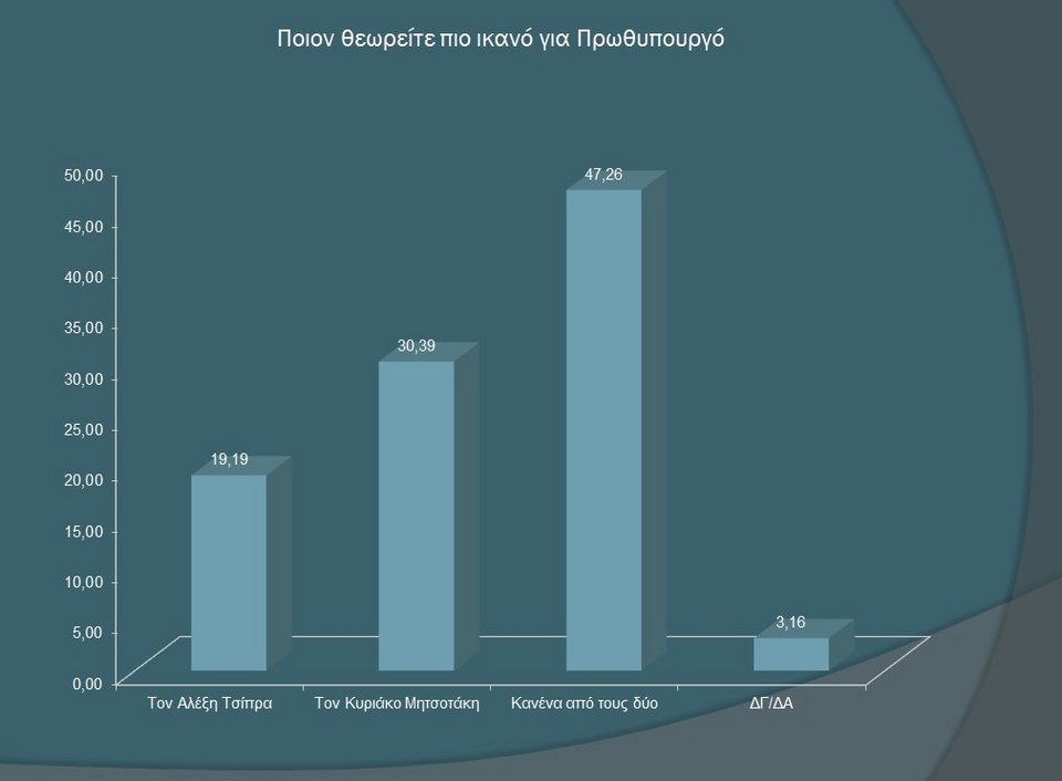 Το 47,26% δε θεωρεί κανέναν εκ των Αλέξη Τσίπρα και Κυριάκου Μητσοτάκη ικανό για πρωθυπουργό.