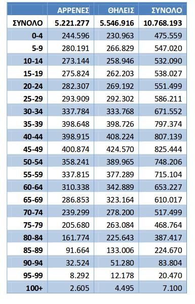 Οπως προκύπτει από τα στοιχεία της ΕΛΣΤΑΤ στο σύνολο του πληθυσμού οι γυναίκες υπερτερούν των ανδρών ενώ υπάρχουν και 7.100 άτομα άνω των 100. Στο σύνολο του πληθυσμού τα άτομα άνω των 70 ετών είναι 1.709.724 εκ των οποίων οι 741.838 ανδρες 967.886 γυναίκες.