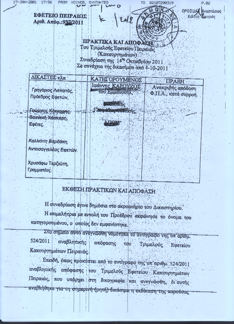 Από τις 14 Οκτωβρίου του 2011 φυγοδικεί ο επιχειρηματίας Ιωάννης Καρούζος καθώς με απόφαση του Τριμμελούς Εφετείου Πειραιά είχε καταδικαστεί ερήμην σε κάθειρξη 8 ετών χωρίς αναστολή.