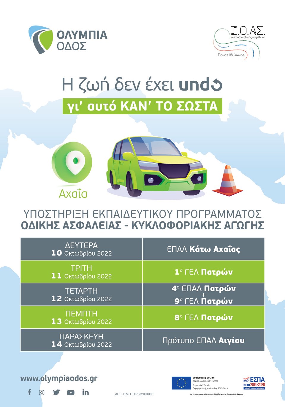 Ολυμπία Οδός και Ινστιτούτο Οδικής Ασφάλειας «Πάνος Μυλωνάς» (ΙΟΑΣ), ενώνουν δυνάμεις και παρουσιάζουν σε σχολεία της Αχαΐας και της Κορινθίας το βιωματικό πρόγραμμα εκπαίδευσης «Καν’το σωστά».