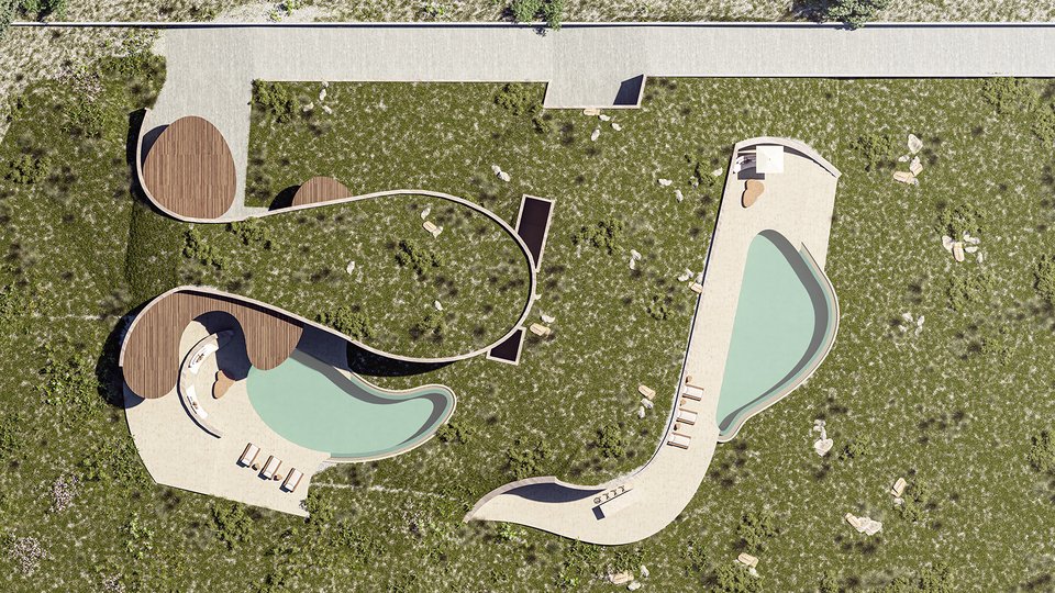 Η σύνθεση αποτελείται από δύο στοιχεία που ενοποιούνται σε έναν όγκο από σκυρόδεμα, ο οποίος χαρακτηρίζεται από έντονες, αεροδυναμικές καμπύλες που δίνουν στο έργο έναν φουτουριστικό χαρακτήρα. Πρόκειται για δύο κατοικίες: μια κύρια και έναν αυτόνομο ξενώνα. Η πρώτη βρίσκεται στο ισόγειο, έχει μια πράσινη στέγη με χαμηλή βλάστηση που την ενσωματώνει πλήρως στον λόφο και μπορεί να φιλοξενεί έξι άτομα. Η δεύτερη κατοικία λειτουργεί σαν ξενώνας και είναι πλήρως υπόσκαφη, διαθέτοντας δική της πισίνα και έναν εντυπωσιακό περιβάλλοντα χώρο με μοντέρνο design. Ο ξενώνας αυτός μπορεί να τέσσερα ακόμα άτομα.