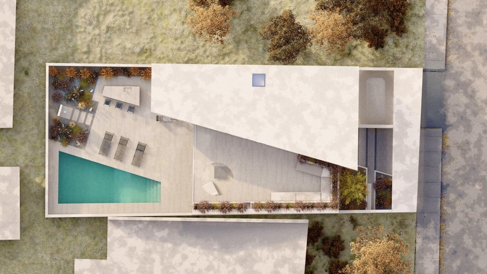 Μια περίκλειστη αυλή, ένα παραλληλόγραμμο, ένα ελλειπτικό τρίγωνο και μια γεωμετρική πισίνα που μοιάζουν να έχουν βγει από το πυθαγόρειο θεώρημα. Η αρχιτεκτονική αγαπά, τελικά, πολύ τη γεωμετρία.
