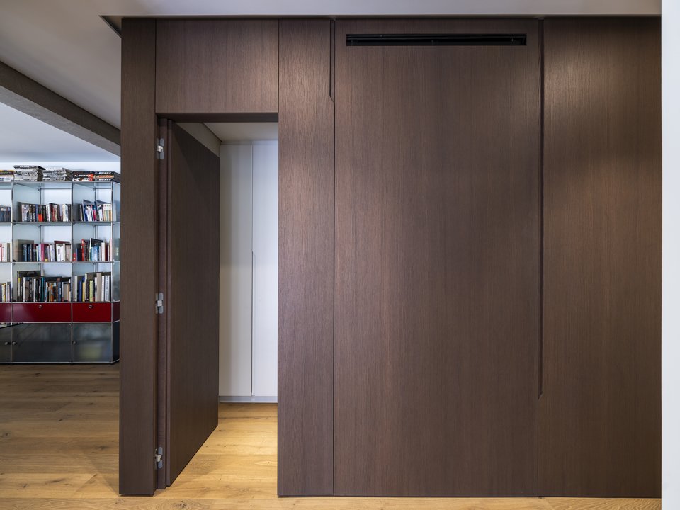 Με έξυπνες ιδέες, λύσεις και στρατηγικές οι αρχιτέκτονες χρησιμοποίησαν ως βασικά τους εργαλεία έπιπλα αποθήκευσης, βιβλιοθήκες, εντοιχισμένες ξύλινες ντουλάπες, συνθέσεις με πάγκους και επιτοίχια συστήματα οργάνωσης του σπιτιού που κρύβουν εσοχές και ράφια πίσω από τις ξύλινες επενδύσεις των τοίχων.
