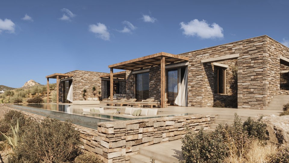 «Η κύρια κτιριακή σύνθεση οργανώνεται σε δύο επιμέρους λίθινους όγκους: έναν που φιλοξενεί τους κοινόχρηστους χώρους και τη διημέρευση, και έναν δεύτερο για τους χώρους ύπνου και ιδιωτικότητας. Ανάμεσά τους αναπτύσσεται το υπαίθριο επίκεντρο της κατοικίας στις Κυκλάδες. Μια “ενδιάμεση σκηνή” καθημερινής ζωής με την πέργκολα και τα καθιστικά. Κατά μήκος αυτών, χωροθετείται ο διάδρομος που ενώνει τους δύο όγκους και ορίζει την είσοδο. Η διαδρομή αυτή αποτελεί σκηνοθετημένη εμπειρία, μια σταδιακή αποκάλυψη των υπαίθριων χώρων. Του σκιασμένου καθιστικού, της ηλιόλουστης πλατφόρμας με την κολυμβητική δεξαμενή και, τελικά, της μακρινής θέας στον ορίζοντα στο Αιγαίο. Αυτή η εμπειρική αλληλουχία του κυκλαδίτικου τοπίου συνιστά τον πυρήνα της αρχιτεκτονικής αφήγησης του έργου» , εξηγούν οι δημιουργοί.