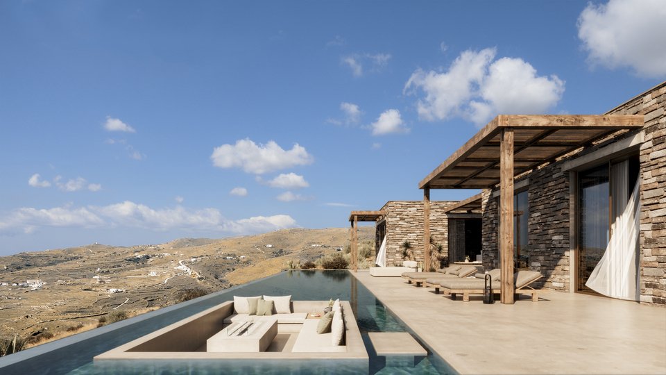«Οι εξωτερικοί χώροι σχεδιάστηκαν ως ισότιμοι με τους εσωτερικούς. Με άλλα λόγια, πρόκειται για υπαίθρια “δωμάτια”, με καθορισμένες στάσεις, υλικότητα και προσανατολισμό. Επιπλέον, η θέα από αυτούς, δεν αποτελεί διακοσμητικό πλαίσιο, αλλά βασικό εργαλείο σχεδιασμού με ανθρώπινη κλίμακα. Ιδιαίτερη έμφαση δόθηκε στην νυχτερινή εμπειρία, όπου το φως των γύρω οικισμών στα απέναντι νησιά δημιουργεί μια αίσθηση σιωπηλής συντροφιάς. Αναμφισβήτητα, αυτή η διακριτική παρουσία ενισχύει το αίσθημα οικειότητας και ασφάλειας. Τη θέαση αλλά και της συσχέτιση ανάμεσα στους ανθρώπινους οικισμούς και το φυσικό περιβάλλον. Σε αυτό το πλαίσιο, οι υπαίθριοι χώροι δεν λειτουργούν ως "συμπλήρωμα" της κατοικίας στην Τήνο. Αντιθέτως, αποτελούν δομικά στοιχεία της σύνθεσης. Οργανώνονται ως υπαίθρια "δωμάτια" με σαφή προσανατολισμό και οριοθέτηση, ως "κενά" ισότιμα με τα "πλήρη", και ως αναπόσπαστο μέρος της αρχιτεκτονικής εμπειρίας σε αυτό το νησί στις Κυκλάδες», λένε οι ίδιοι.