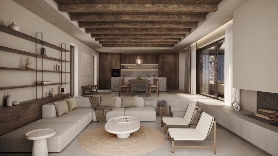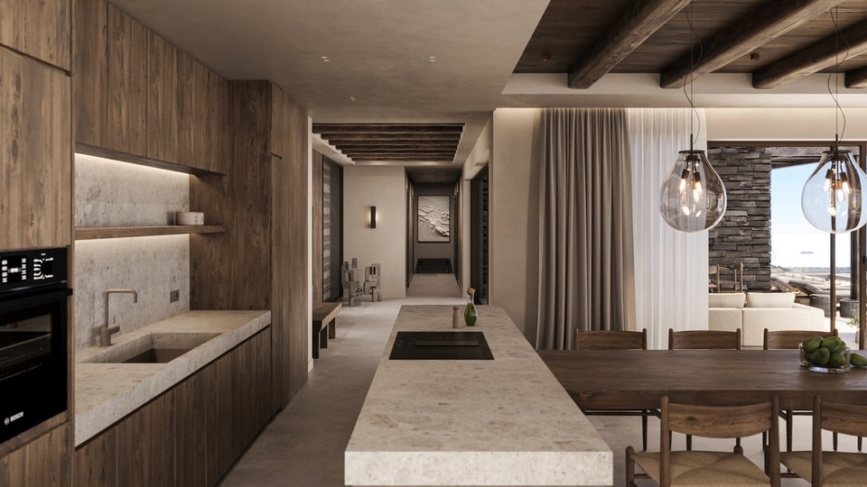 Στο εσωτερικό, ο σχεδιασμός ακολουθεί την ίδια γήινη παλέτα, με το χρώμα της άμμου να κυριαρχεί ταυτόχρονα με το ξύλο. Έτσι υπάρχει μια αίσθηση αρμονικής συνέχειας με τους εξωτερικούς χωρους.