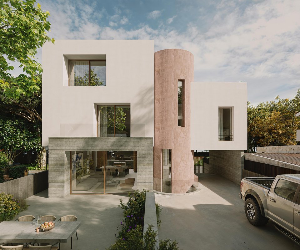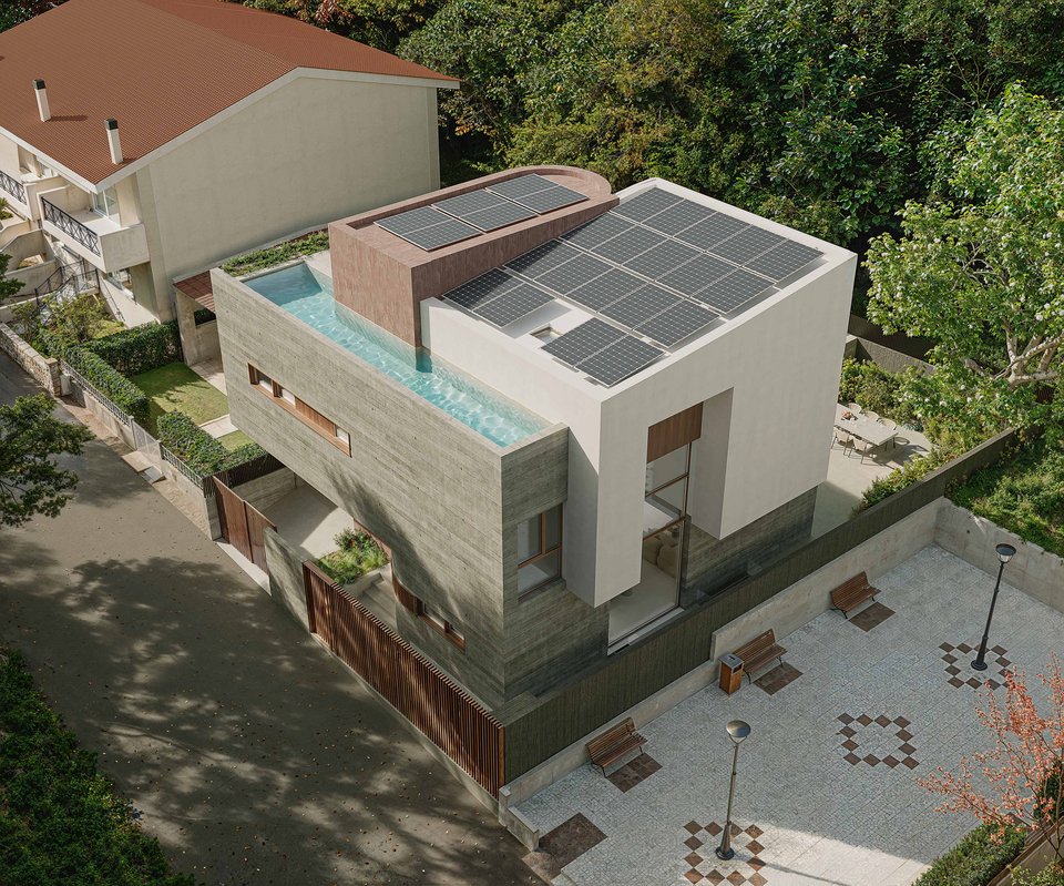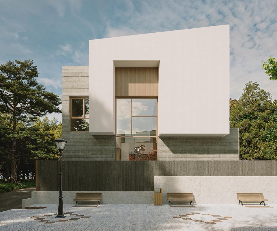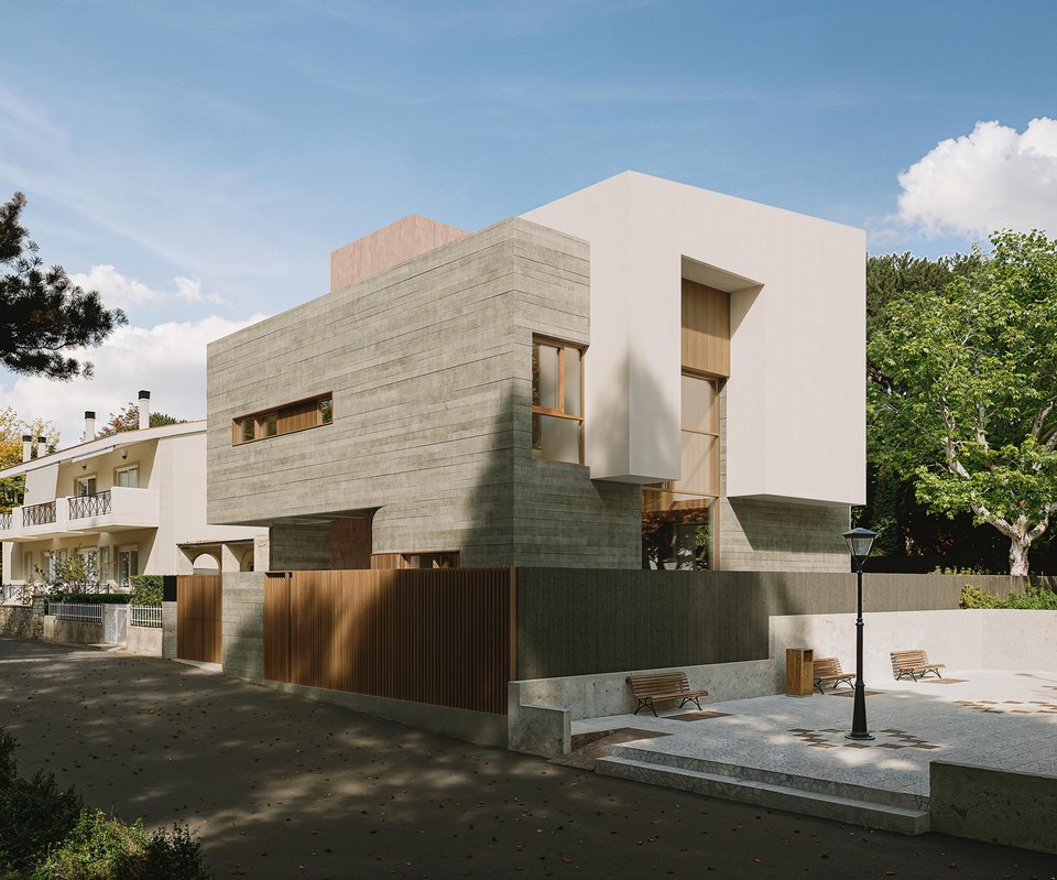 «Το κτίριο, τοποθετημένο ανάμεσα στο όριο του δομημένου ιστού του οικισμού και στο φυσικό τοπίο του ρέματος, επιχειρεί να λειτουργήσει ως σημείο μετάβασης, όπου η ένταση της καθημερινότητας συναντά την ηρεμία της φύσης. Σε αυτό το περιβάλλον, η αρχιτεκτονική στρέφεται προς τα μέσα, δημιουργώντας έναν χώρο-καταφύγιο, που δεν αποκόπτεται από το περιβάλλον του, αλλά παραμένει συνειδητά εσωστρεφής. Η μονολιθική εξωτερική επιδερμίδα από εμφανές σκυρόδεμα λειτουργεί τόσο ως προστατευτικό κέλυφος όσο και ως ακουστικό και οπτικό όριο, εντείνοντας την απομόνωση και την ηρεμία στο εσωτερικό. Πίσω από αυτό το περίβλημα, η ζωή οργανώνεται γύρω από εσωτερικές αυλές, φίλτρα φωτός και σκιάς, και διαφάνειες που επιτρέπουν τη σύνδεση και την οπτική επαφή με το φυσικό τοπίο, το νερό και τη βλάστηση στο πίσω τμήμα του οικοπέδου», εξηγεί η αρχιτεκτονική ομάδα του γραφείου Façade.