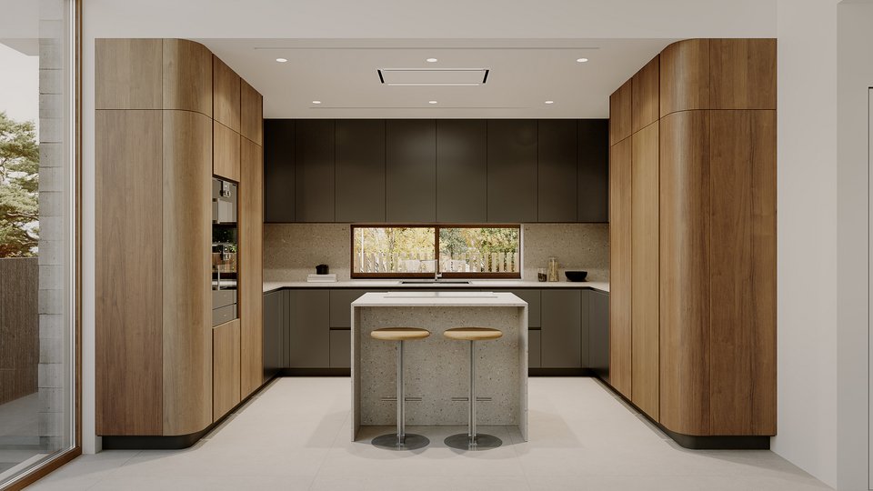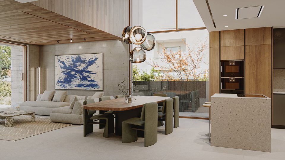 Στο εσωτερικό η παλέτα γίνεται γήινη, προσφέροντας μια cosy ατμόσφαιρα σε κάθε γωνιά. Μεγάλα παράθυρα αφήνουν το φυσικό φως να εισβάλει σε κάθε γωνιά και να προσφέρει ευεξία στην καθημερινότητα. Παράλληλα η θέα στον κήπο, στα δέντρα και τα φυτά, μετατρέπει τα κρυστάλλινα αυτά ανοίγματα σε ζωντανούς καμβάδες που αλλάζουν ανάλογα με την ώρα και τη θέση του ήλιου.