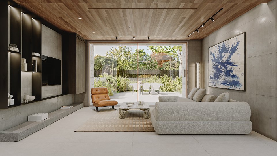 Ευεξία και φως στο εσωτερικό με το ζεστό ξύλο να συνομιλεί με το μίνιμαλ σκυρόδεμα