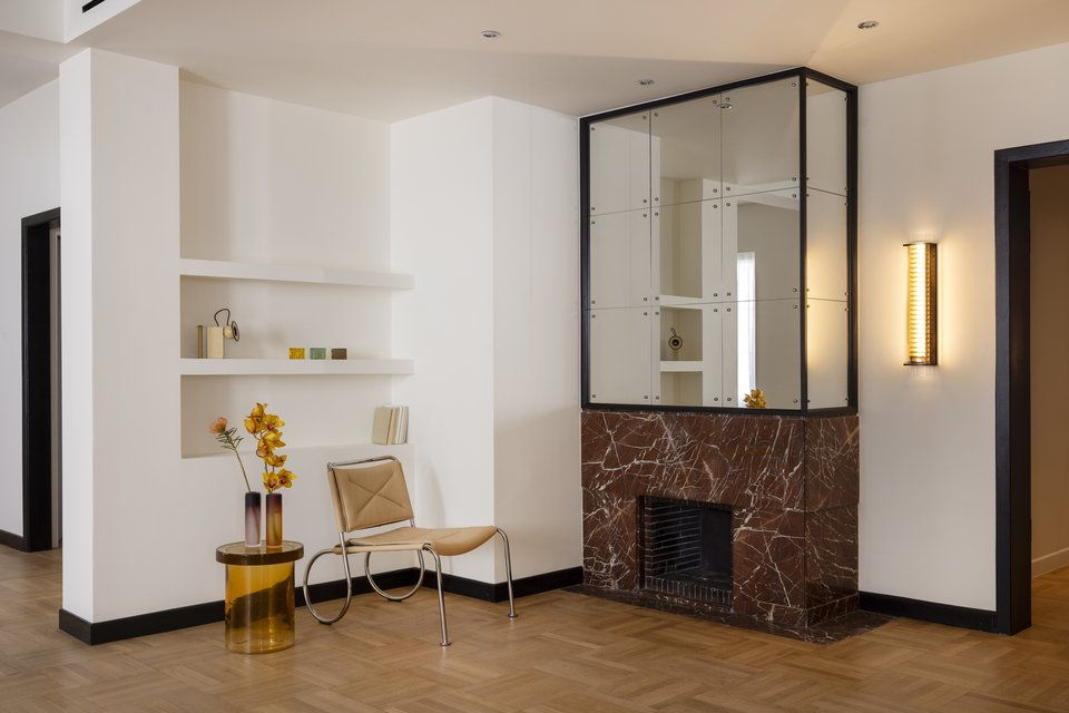 Στη ζώνη των κοινόχρηστων χώρων έγιναν επίσης αλλαγές: «Κατά την είσοδο, μια ακολουθία τριών πρώην ξεχωριστών χώρων υποδοχής ενοποιήθηκε με την αφαίρεση των ενδιάμεσων χωρισμάτων, σχηματίζοντας έναν ενιαίο, επιμήκη χώρο διαβίωσης. Το φως της ημέρας εισέρχεται απευθείας από την μπροστινή πρόσοψη του κτιρίου, καθιστώντας την την πιο φωτεινή ζώνη του διαμερίσματος. Το αρχικό κόκκινο μαρμάρινο τζάκι, που βρίσκεται προς το πίσω μέρος του κεντρικού χώρου, ανακαινίστηκε προσεκτικά και παραμένει ένα από τα κεντρικά σημεία του δωματίου. Πολλαπλά πάνελ καθρέφτη πλαισιωμένα σε γυαλιστερό μαύρο επεκτείνουν την παρουσία του, ευθυγραμμιζόμενα με τα έντονα σοβατεπί και τα πλαισιωμένα πρωτεύοντα ανοίγματα για να δημιουργήσουν ένα σαφές αρχιτεκτονικό δεδομένο».