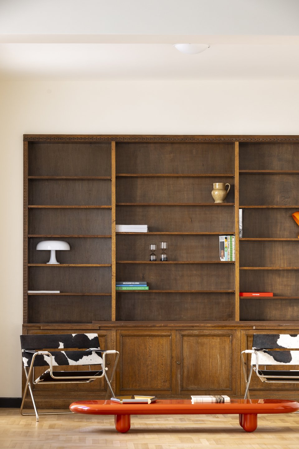 Στον ίδιο χώρο μια μεγάλη εντοιχισμένη βιβλιοθήκη από μασίφ καρυδιά, διατηρήθηκε και αποκαταστάθηκε, προσθέτοντας ζεστασιά και χάρη στο χώρο.