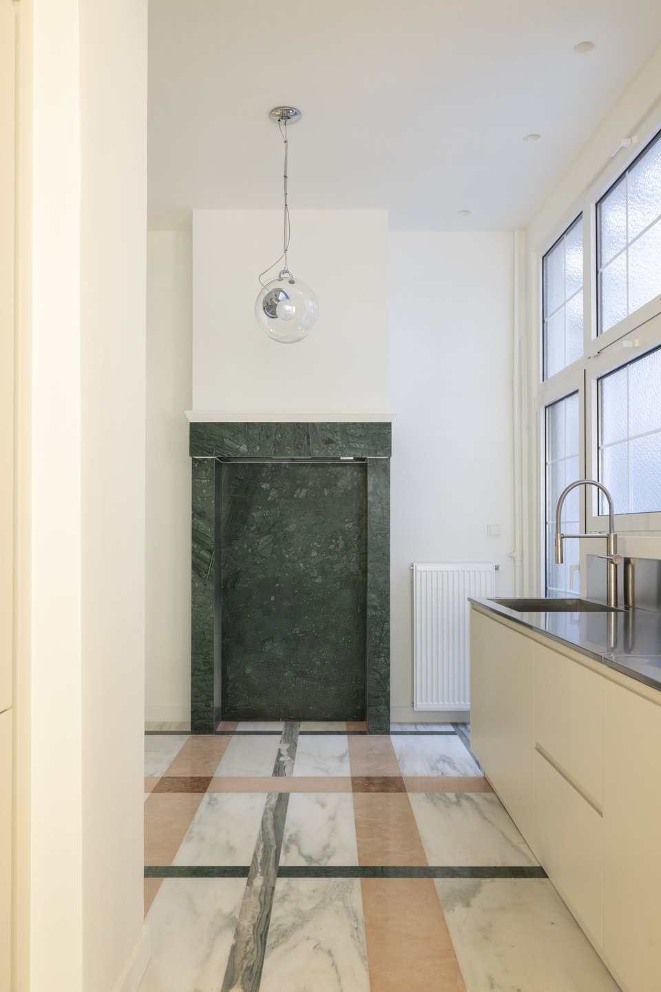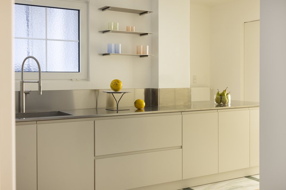 «Η κουζίνα καταλαμβάνει ένα ακανόνιστο, σε σχήμα Ζ αποτύπωμα ως ξεχωριστός χώρος που εφάπτεται του καθιστικού. Αυτή η διάταξη επιλύθηκε με την εισαγωγή ενός μεγάλου, κεντρικού πάγκου από ανοξείδωτο χάλυβα, που χρησιμεύει τόσο ως η κύρια επιφάνεια εργασίας όσο και ως χωρική συσκευή που οργανώνει την κυκλοφορία και τη χρήση. Τα άνω ντουλάπια παραλείφθηκαν σκόπιμα για να διατηρηθεί το ύψος και η οπτική ανοιχτότητα του δωματίου. Ο άφθονος αποθηκευτικός χώρος ενοποιείται σε ντουλάπια πλήρους ύψους, ενσωματώνοντας τόσο το ντουλάπι όσο και τη γενική αποθήκευση μέσα σε μια εσοχή που σχηματίζεται από την υπάρχουσα αρχιτεκτονική γεωμετρία».