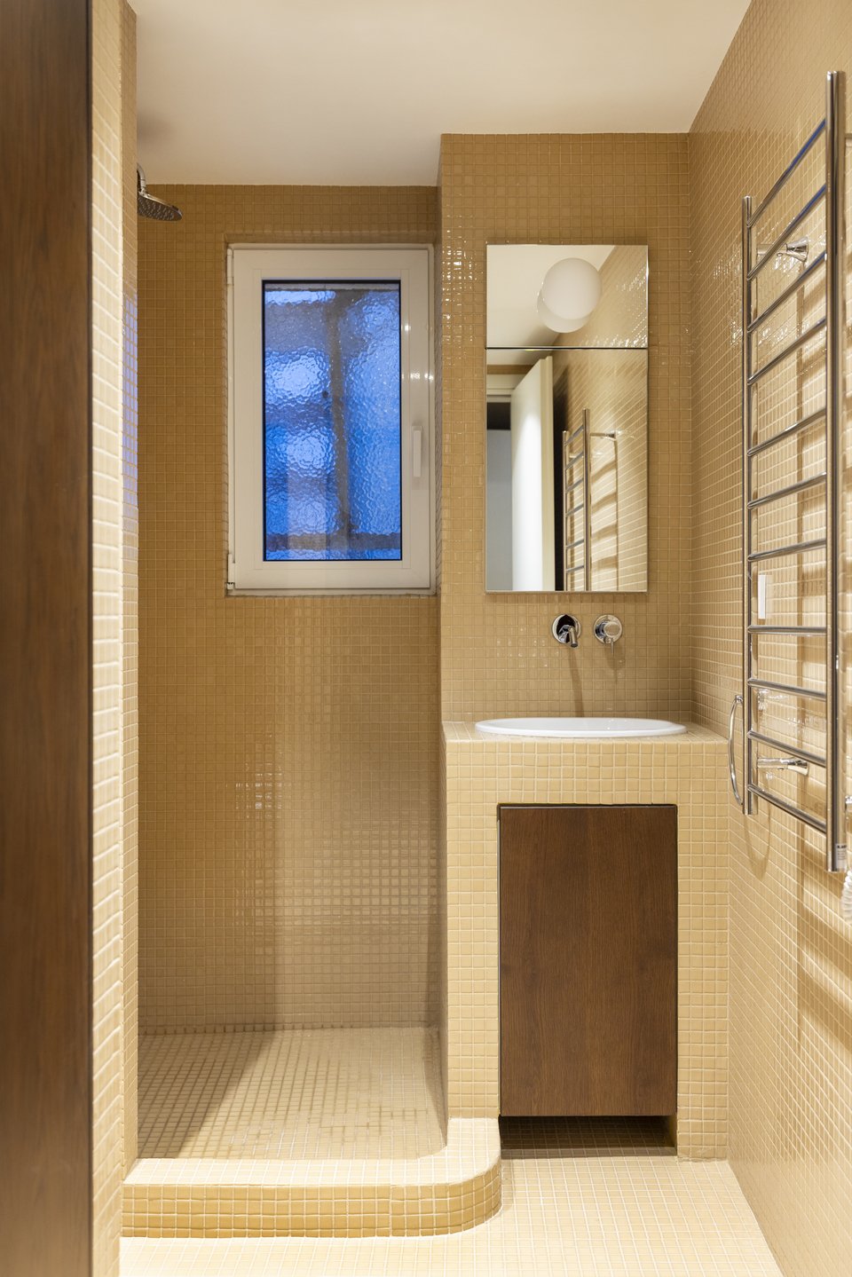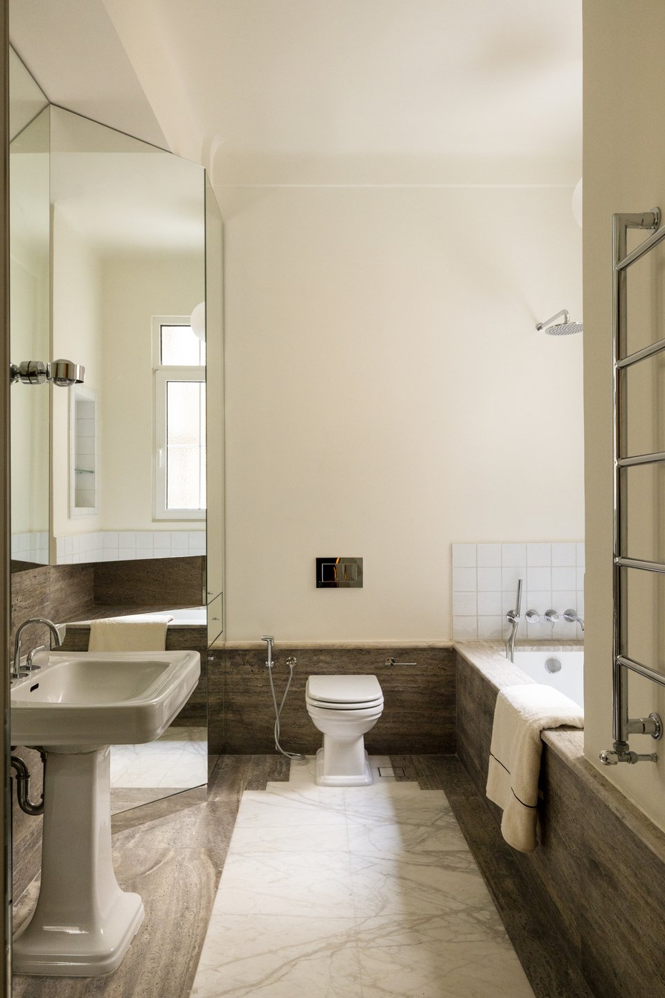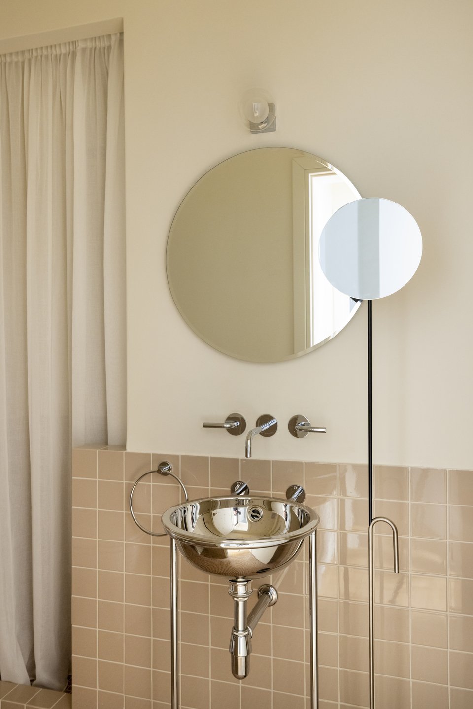 «Δίπλα σε αυτό, ένα ξεχωριστό αναβαθμισμένο WC με ζώνη ημέρας φιλοξενεί επίσης ένα ντους, ειδικά για να υποστηρίξει την περιστασιακή χρήση του δωματίου ως υπνοδωμάτιο επισκεπτών, προσθέτοντας καθημερινή άνεση στο σαλόνι χωρίς να μεταβάλλει τη χωρική ιεραρχία του διαμερίσματος. Τοποθετημένο πάνω σε ένα απαλό ροζ μωσαϊκό δάπεδο, το WC διακόπτεται από τον νιπτήρα από ανοξείδωτο ατσάλι Morgans, σχεδιασμένο από την Andrée Putman το 1985», επισημαίνουν οι συντελεστές.
