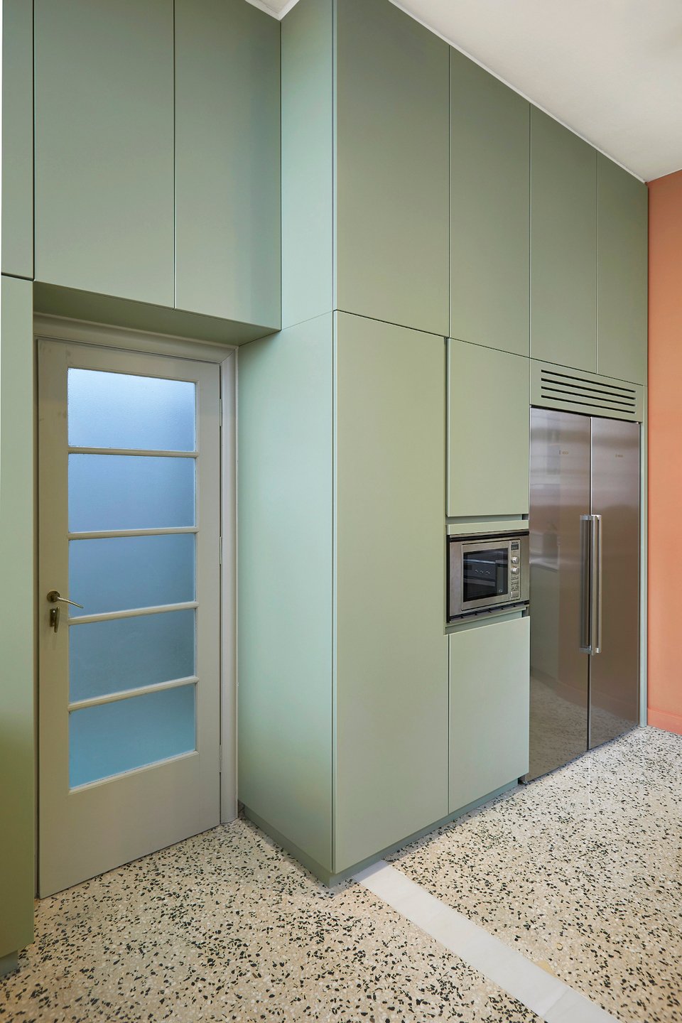 Κεντρικό στοιχείο του καθιστικού αποτελεί μια -ειδικά σχεδιασμένη για τον χώρο- βιβλιοθήκη από μέταλλο και ξύλο. Ανοίγοντας τις συρόμενες ξύλινες πόρτες, το καθιστικό ενώνεται με το γραφείο όπου ένας κόκκινος τοίχος αναδεικνύει τα υφιστάμενα έπιπλα από ξύλο, τα οποία οι ιδιοκτήτες αποφάσισαν να διατηρήσουν. Ο διάδρομος που οδηγεί στους επιμέρους χώρους χρωματίζεται με δύο αποχρώσεις, αναδεικνύοντας τη γεωμετρία του. Στην κουζίνα επιλέγονται πράσινοι παστέλ τόνοι με πορτοκαλί λεπτομέρειες στον τοίχο.