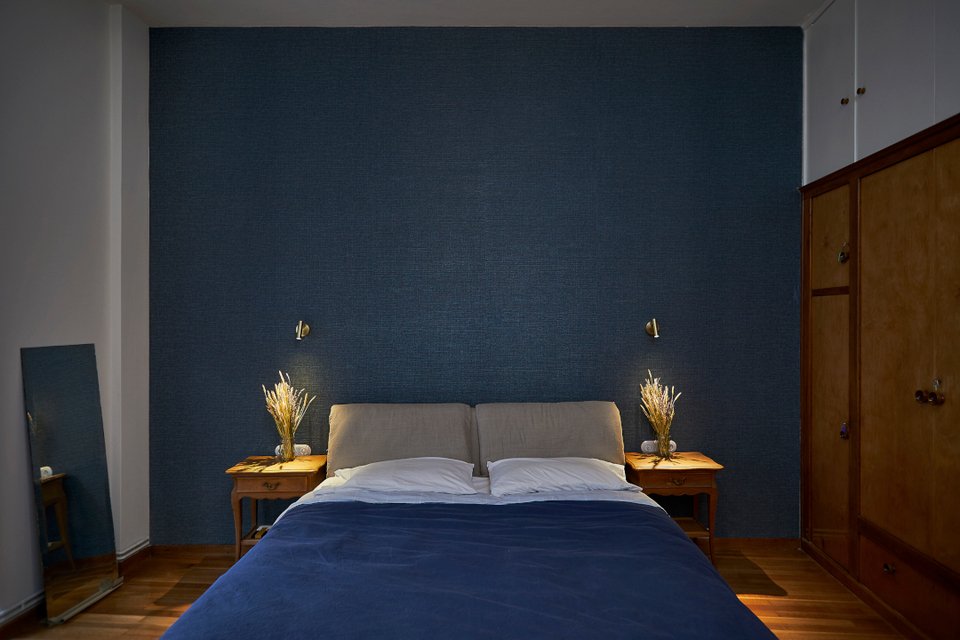 Τα έπιπλα και οι καθρέφτες -από μέταλλο και ξύλο- είναι ειδικά σχεδιασμένα για τον χώρο. Στα δωμάτια διατηρούνται οι υφιστάμενες ντουλάπες, ενώ μια ταπετσαρία σε βαθύ μπλε περιβάλλει το κρεβάτι, δίνοντας μια αίσθηση χαλάρωσης.