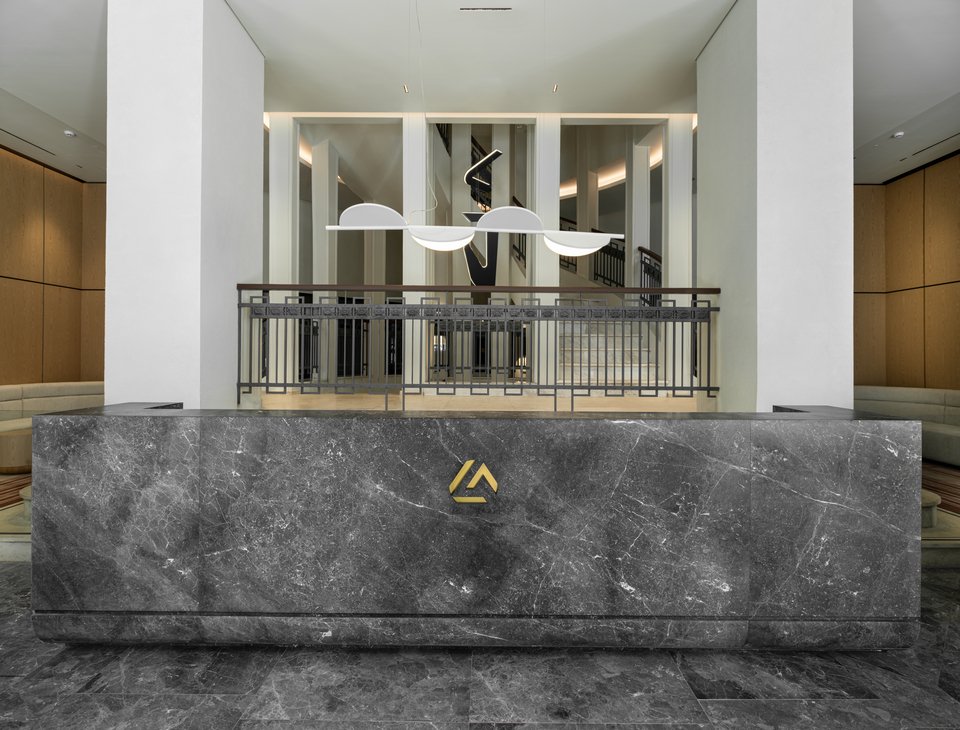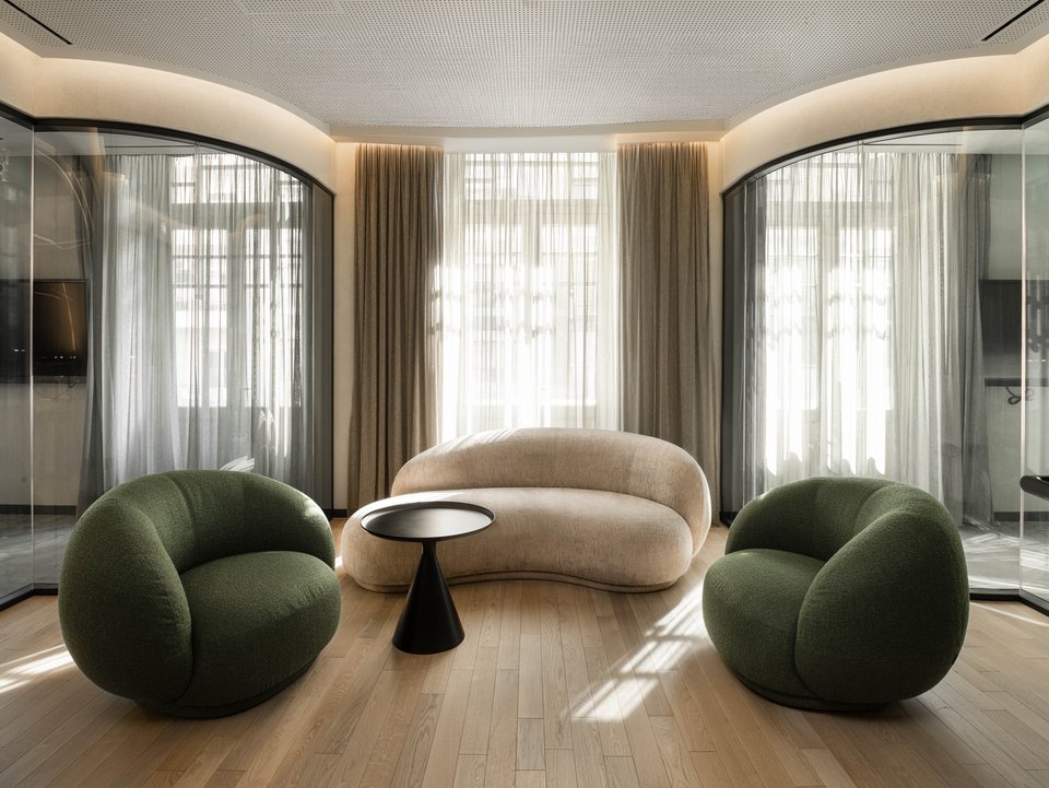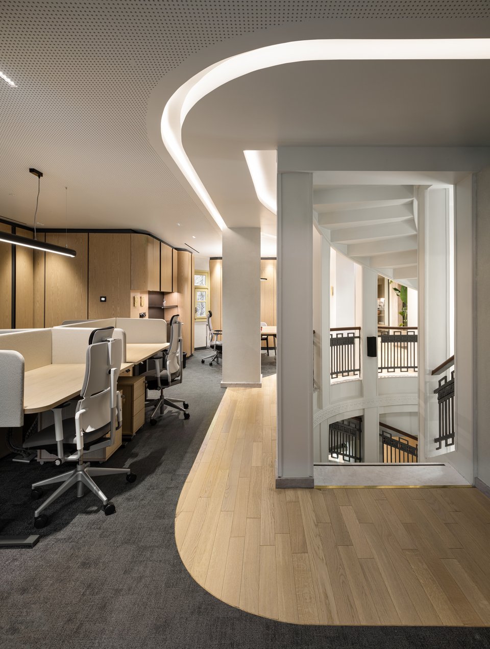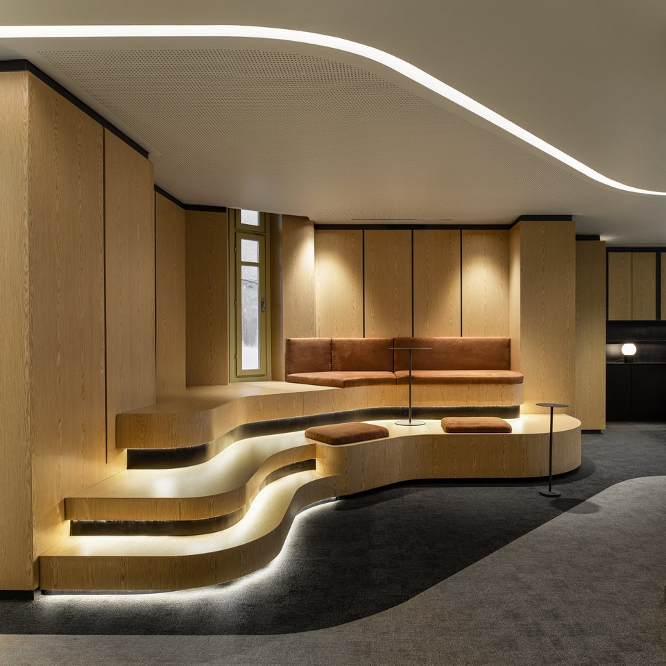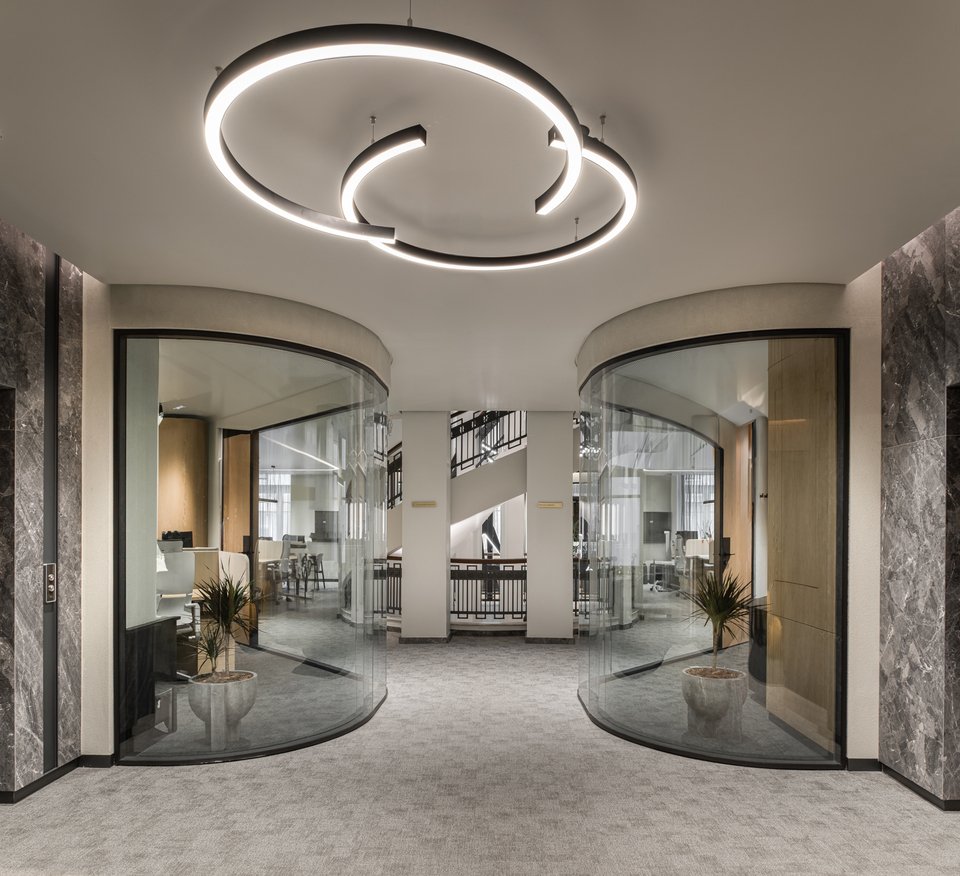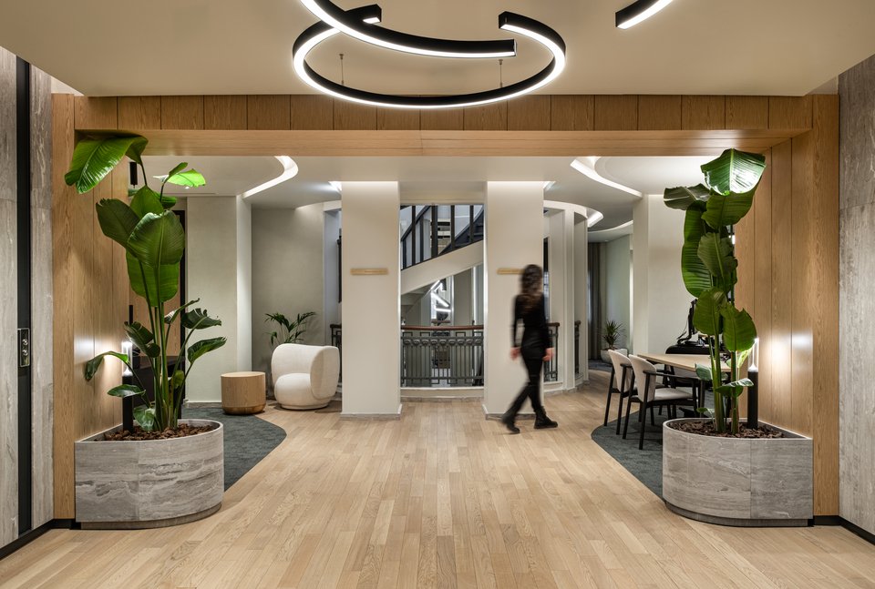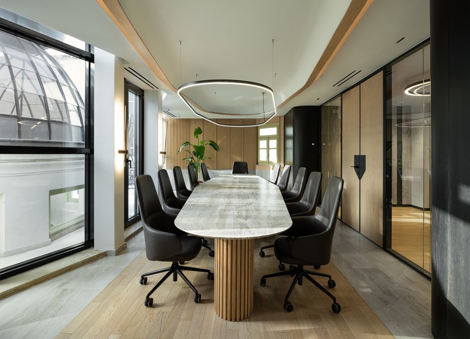 «Η διάταξη του κτιρίου ακολουθεί την αρχή της συμμετρίας, με μια κεντρική ημικυκλική σκάλα η οποία λειτουργεί ως πυρήνας γύρω από τον οποίο οργανώνονται όλοι οι χώροι εργασίας. Οι κομψές καμπύλες της σκάλας και οι καμάρες που πλαισιώνουν τα ανοίγματα του ισογείου καθοδηγούν τις μαλακές, ρευστές γραμμές που συνεχίζονται στους ορόφους και στα ταβάνια, δημιουργώντας μια αρμονική σύνδεση μεταξύ των ιστορικών στοιχείων του κτιρίου και των σύγχρονων εσωτερικών χώρων του. Στην είσοδο του κτιρίου, το κεντρικό λόμπι έχει σχεδιαστεί συμμετρικά, προσφέροντας μια αίσθηση ισορροπίας και μεγαλοπρέπειας. Η αλληλεπίδραση των μαρμάρινων υφών στο δάπεδο και στους τοίχους, σε συνδυασμό με τις χάλκινες λεπτομέρειες, προσδίδει αίσθηση κομψότητας και κύρους, ενώ τα ξύλινα στοιχεία και τα μάλλινα χαλιά προσφέρουν ζεστασιά και άνεση. Από τον πρώτο έως τον τέταρτο όροφο, τα γραφεία και οι ιδιωτικοί χώροι εργασίας οργανώνονται γύρω από δυναμικούς χώρους συνεργασίας. Ο πέμπτος όροφος φιλοξενεί την αίθουσα συνεδριάσεων του εκτελεστικού συμβουλίου, προσφέροντας έναν πιο εκλεπτυσμένο χώρο για διοικητικές συναντήσεις», επισημαίνουν οι δημιουργοί.