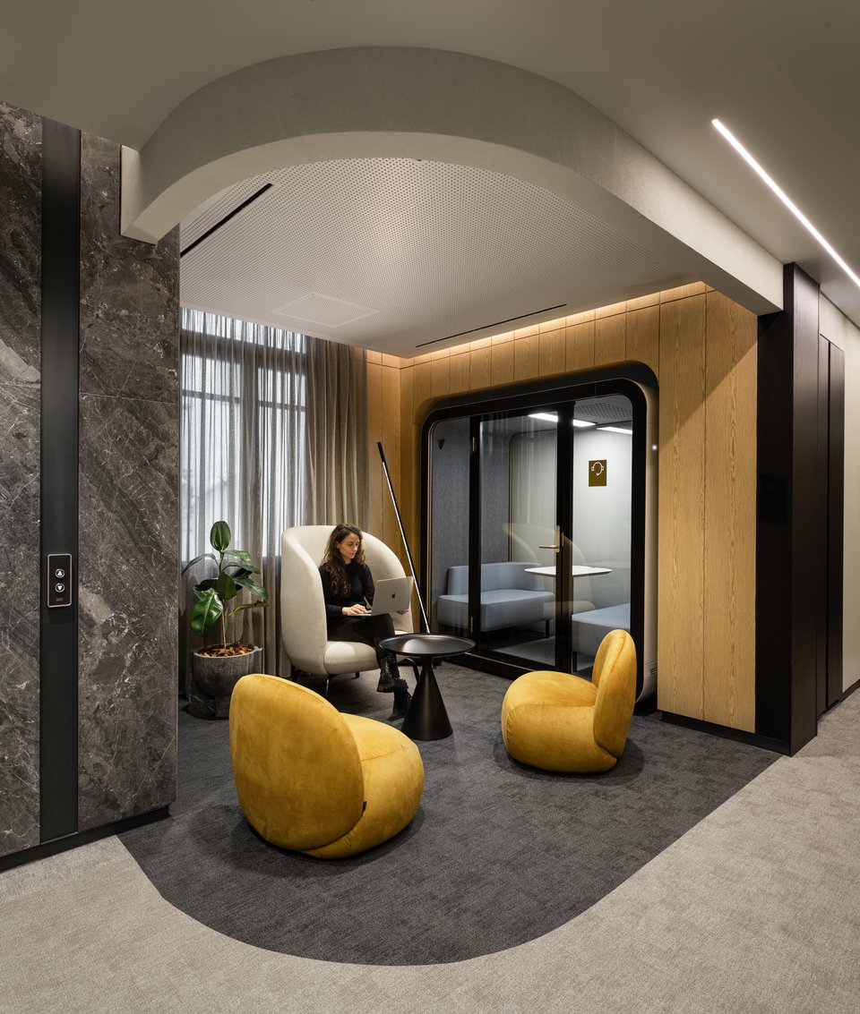 «Ο σχεδιασμός αυτών των χώρων επικεντρώνεται στην ενίσχυση της αλληλεπίδρασης μεταξύ των εργαζομένων, προάγοντας ταυτόχρονα την ευημερία τους και τη δημιουργία ενός λειτουργικού και σύγχρονου εργασιακού περιβάλλοντος», συμπληρώνουν οι αρχιτέκτονες.