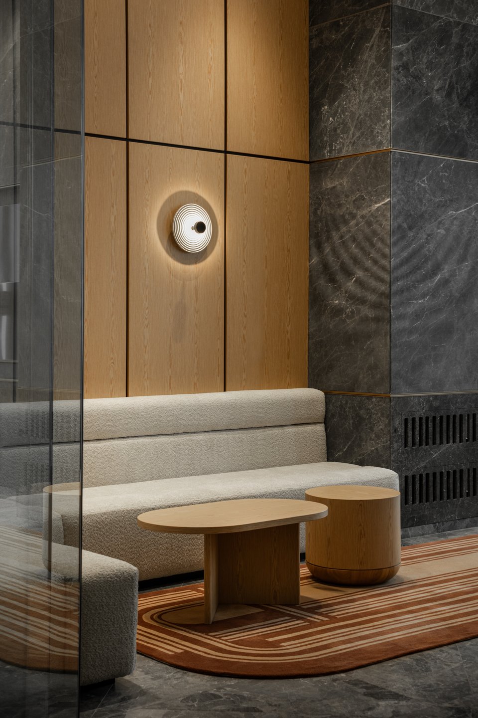 Η επιλογή των υλικών -όπως το βινύλιο με υφασμάτινη υφή στα δάπεδα, τα εκλεπτυσμένα φινιρίσματα από δρυ και μαύρο ξύλο, καθώς και οι πολυτελείς υφασμάτινες υφές- συμβάλλουν στη δημιουργία μιας αισθητικής που συνδυάζει την υψηλή ποιότητα και τη ζεστή φιλοξενία. Οι ρευστές γραμμές στα δάπεδα και στα ταβάνια αναδεικνύονται με κρυφό φωτισμό και καθοδηγούν απαλά την κίνηση στον χώρο, ενισχύοντας την εμπειρία του χρήστη.