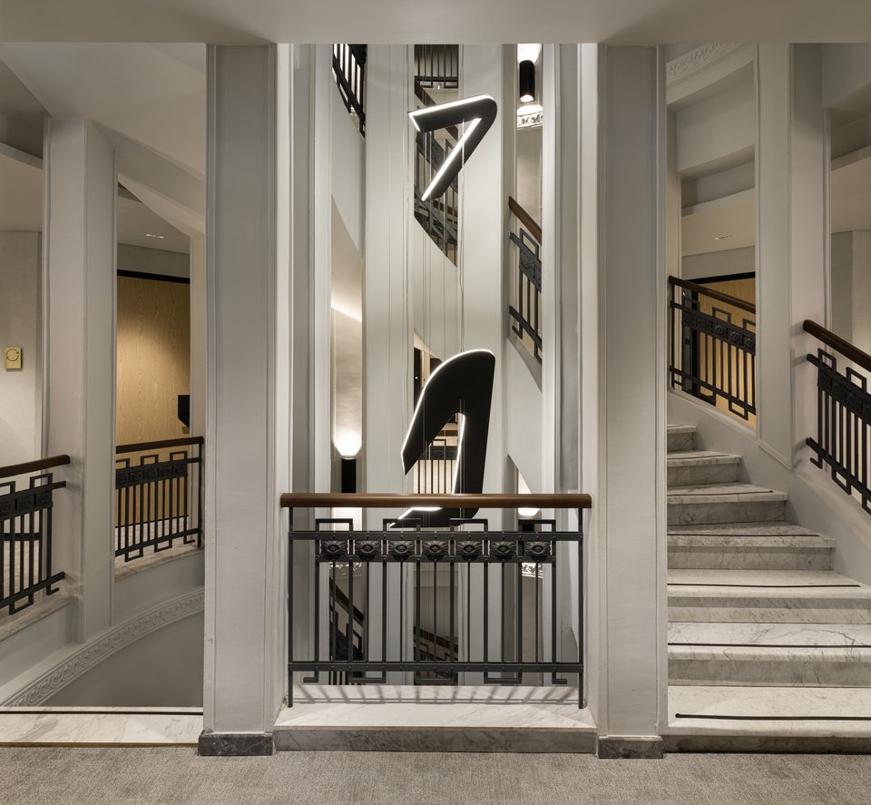 «Στο κέντρο του κτιρίου, η σκάλα δεν είναι απλώς ένα στοιχείο μετάβασης στους διαφορετικούς ορόφους: Αποτελεί ένα εμβληματικό αρχιτεκτονικό χαρακτηριστικό, με ένα κρεμαστό φωτιστικό που εκτείνεται κάθετα σε όλη την κατασκευή. Ο σχεδιασμός του φωτισμού αντλεί στοιχεία από την εταιρική ταυτότητα της Eurobank, συνδέοντας τον ιστορικό χαρακτήρα του κτιρίου με τη σύγχρονη και δυναμική φιλοσοφία της τράπεζας», καταλήγουν οι αρχιτέκτονες του Urban Soul Project.
