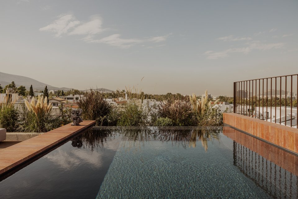 Με έκταση 230 τ.μ., το διαμέρισμα καταλαμβάνει δύο επίπεδα σε μια εντυπωσιακή πολυκατοικία μιας νεόδμητης πολυκατοικίας σε έναν ήσυχο, καταπράσινο δρόμο στην περιοχή Παπάγου, η οποία χαρακτηρίζεται από τη γεωμετρία και τους ήπια μοντερνιστικούς τόνους, με σμιλεμένες καμπύλες και γωνίες, συνδυάζοντας το ξύλο, τις μεταλλικές οξειδωμένες επιφάνειες, το σκυρόδεμα και την πέτρα με την πλούσια μεσογειακή φύση.