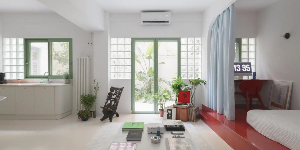 Το βασικό ζητούμενο ήταν η δημιουργία ενός ενιαίου αλλά ταυτόχρονα ευέλικτου χώρου, ικανού να προσαρμόζεται στις ανάγκες της καθημερινότητας χωρίς βαριές κατασκευές. Έτσι, αντί για το κλασικό υπνοδωμάτιο, επιλέχθηκε μια πιο «ελαφριά» λύση -το κρεβάτι τοποθετήθηκε σε υπερυψωμένη πλατφόρμα, δημιουργώντας μια αίσθηση διακριτής ζώνης μέσα στον ίδιο χώρο. Η πλατφόρμα, βαμμένη σε γυαλιστερό κόκκινο, λειτουργεί σαν χρωματικό statement, ενώ μια γαλάζια κουρτίνα συσκότισης επιτρέπει την ιδιωτικότητα όταν χρειάζεται, χωρίς να κόβει οριστικά τον χώρο με τοίχους.