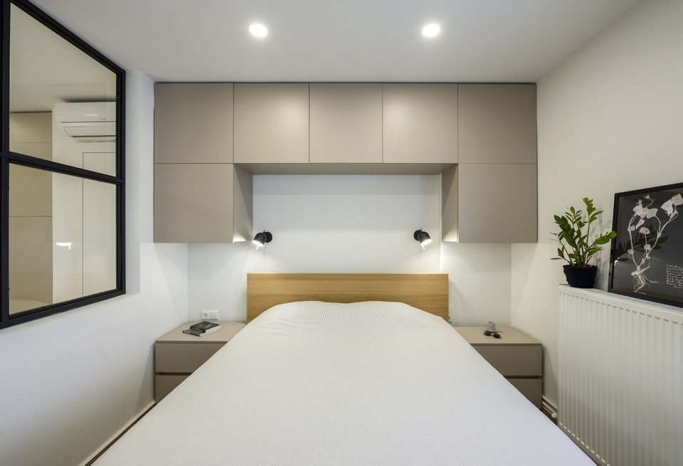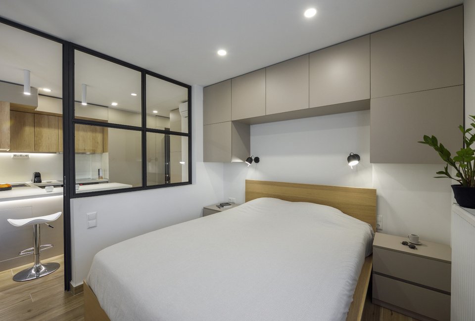Τα γυάλινα υαλοπετάσματα στην περίπτωση του υπνοδωματίου έχει τη δυνατότητα είτε να κλείνει και να προσφέρει ιδιωτικότητα, είτε να ανοίγει οπότε ο χώρος να ενσωματώνεται στην open air συνολική αίσθηση του διαμερίσματος. Σε κάθε περίπτωση φίνες λεπτομέρειες και μικροέπιπλα κάνουν τη σύνδεση μεταξύ των χώρων ώστε να δημιουργείται μια ενιαία ατμόσφαιρα που χαρακτηρίζεται από οικειότητα και φιλόξενη διάθεση.