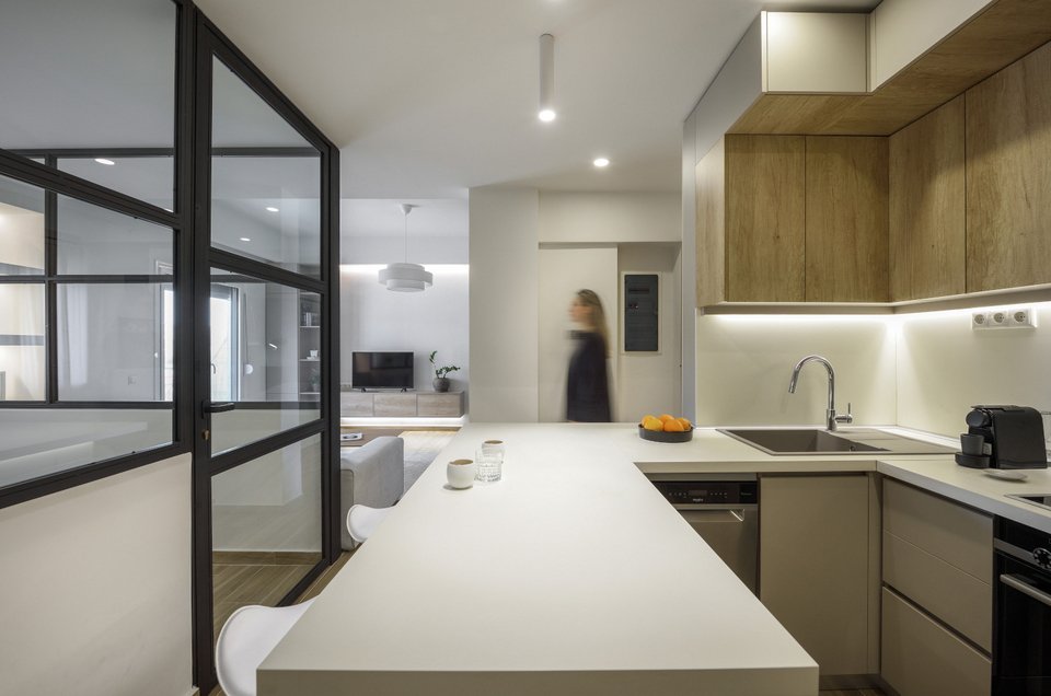 Η κουζίνα λειτουργικά πλήρης, είναι και αυτή ένα semi-open box που έχει σχεδιαστεί για να πλέει στον διάδρομο κίνησης του διαμερίσματος. Με την ουδέτερη επιδερμίδα της και τις ματ υφές της δεν φωνάζει το ρόλο της απλά τον υπηρετεί ήσυχα. Κατά τη λειτουργία μέσα σε αυτή, ο χρήστης έχει την απόλυτη σύνδεση με τους υπόλοιπους χώρους του σπιτιού και την οπτική επαφή με την κάθε γωνιά του.