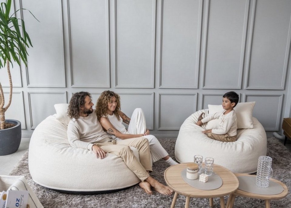 Μια άλλη ενδιαφέρουσα επιλογή είναι οι μεγάλες μαξιλαρο-πολυθρόνες, ή ακόμη δύο πουφ σε συνδυασμό με μια σεζλόνγκ. Αν υπάρχει αρκετός χώρος, μπορούμε —όπως αναφέραμε και πριν— να τοποθετήσουμε και ένα όμορφο τραπεζάκι σαλονιού.