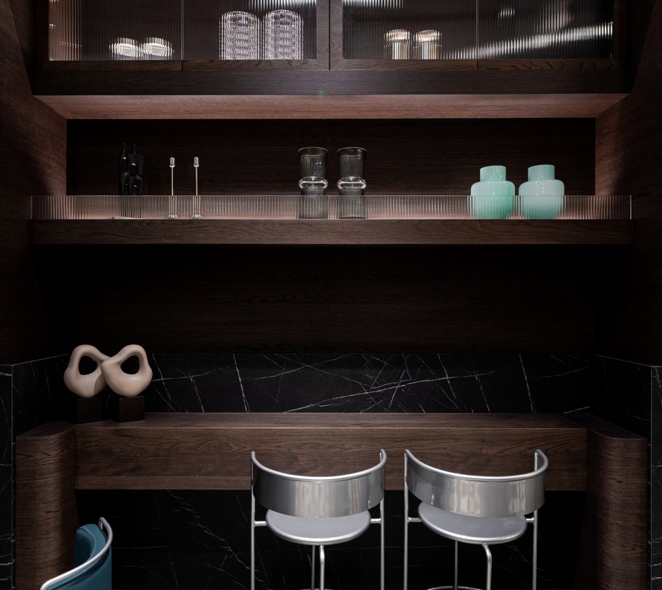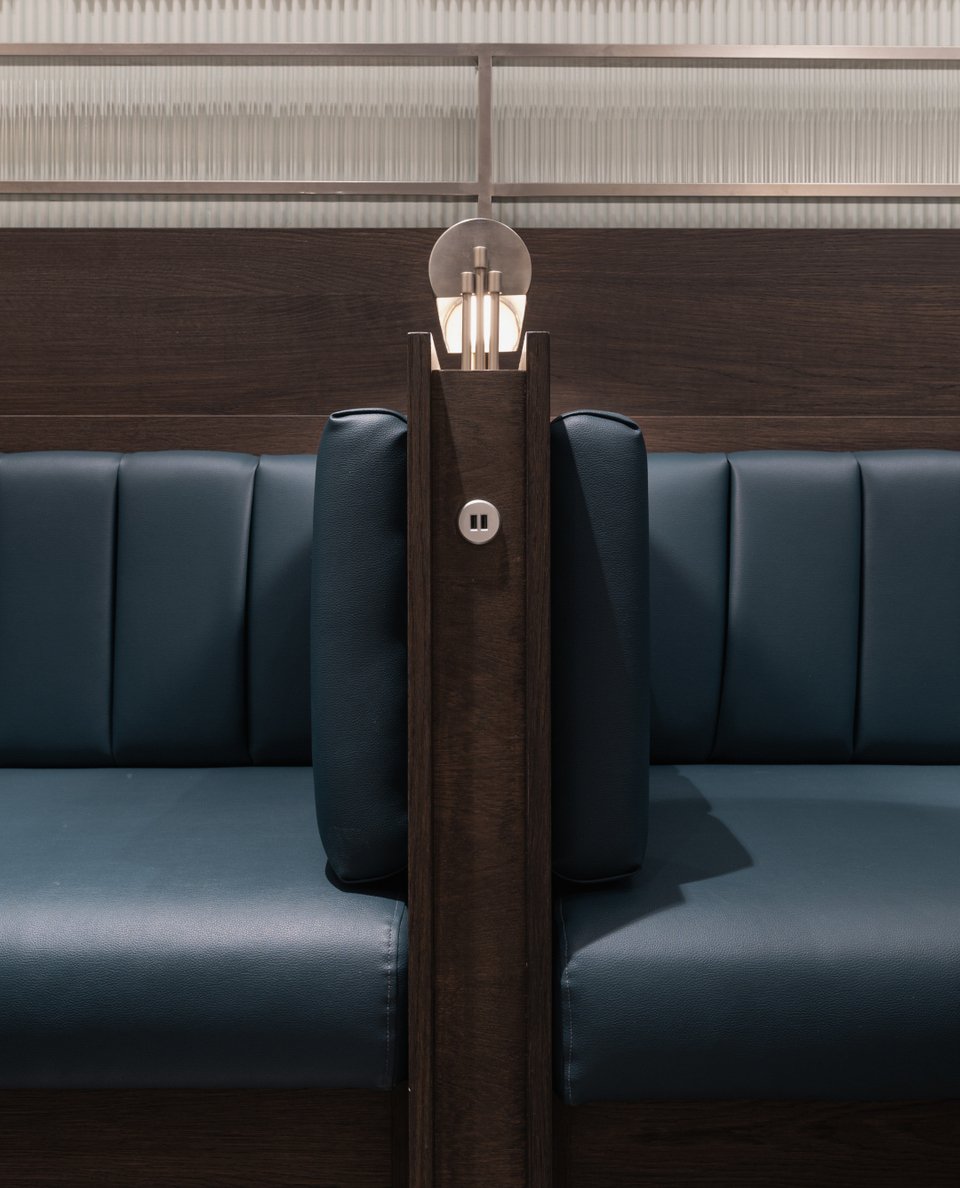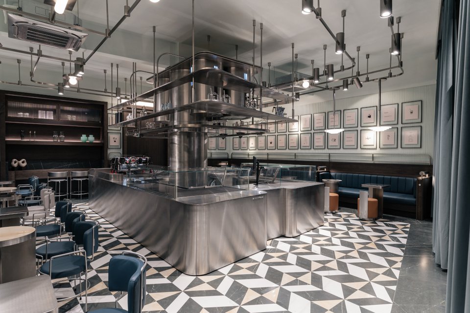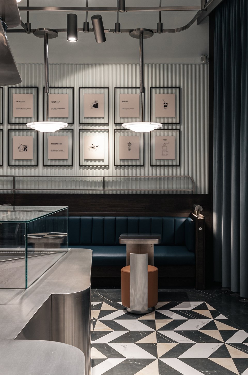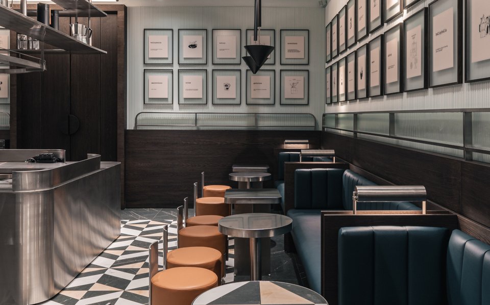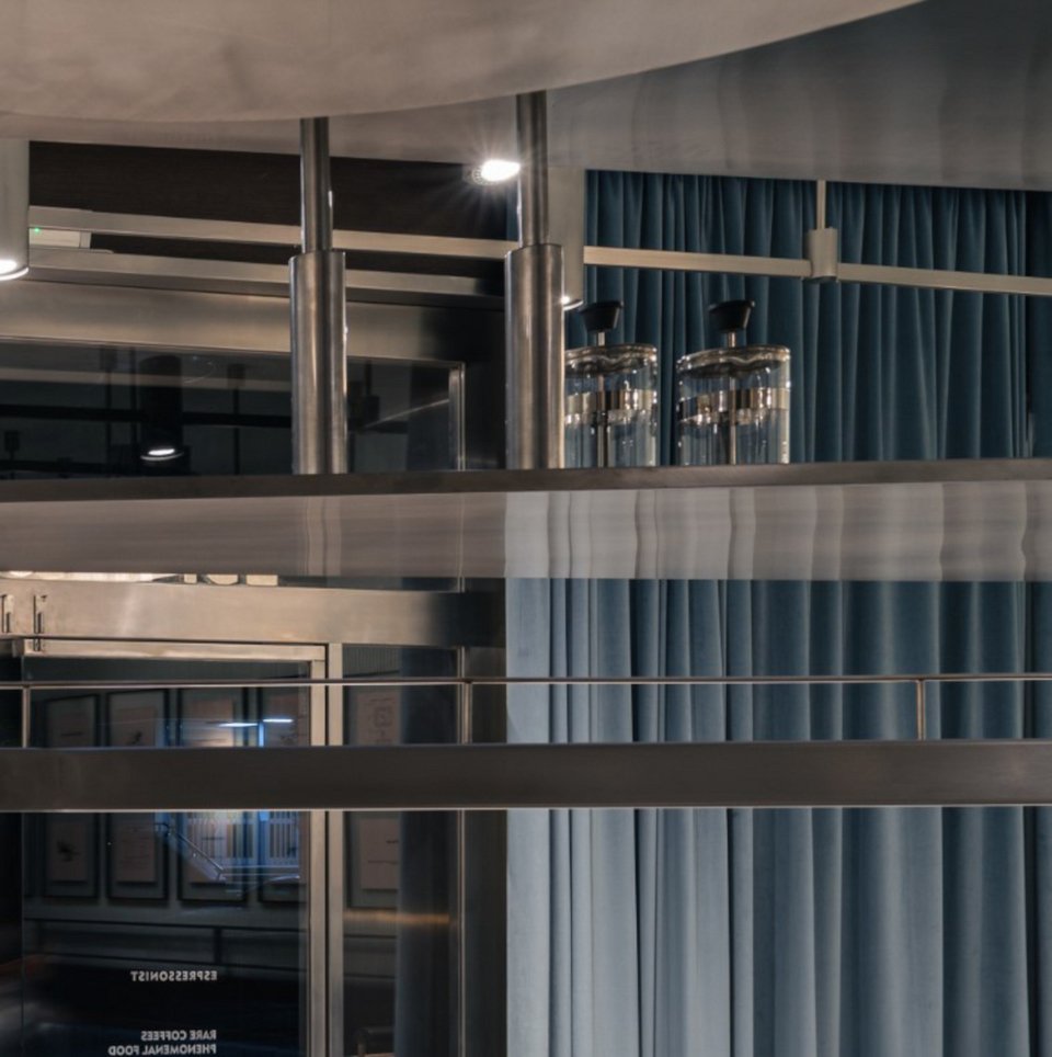Γύψινα στοιχεία, βελούδινες κουρτίνες, δερμάτινες ταπετσαρίες σε μπλε αποχρώσεις, μια νύξη προς την ταυτότητα της μάρκας The Espressonist, προσθέτουν μια πινελιά χρώματος στο κατά τα άλλα αχρωματικό εσωτερικό.