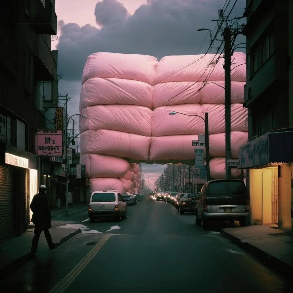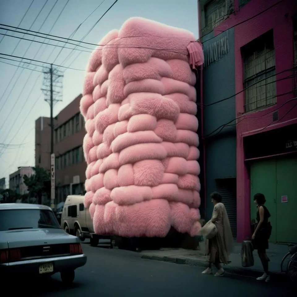 Ο καλλιτέχνης φαντάζεται ιστορικά αρχιτεκτονήματα σε μεγάλες πόλεις να καλύπτονται με απτό, χνουδάτο και ενίοτε τριχωτό «μαλλί της γριάς».