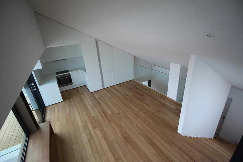 Ο λευκός περιμετρικός τοίχος του ορόφου κατασκευασμένος από μεταλλικό σκελετό και ινοσανίδες αποκολλήθηκε από το πατρικό σπίτι μέσω μιας σχισμής η οποία διατρέχει την βάση του. Ο όγκος της νέας κατοικίας ξεπροβάλει από πίσω του και με έντονη κλίση κορυφώνεται σε ένα καθιστικό στον δεύτερο όροφο που προσφέρει απλόχερα πανοραμική θέα της πόλης από ψηλά. Έτσι η καινούρια κατοικία μοιάζει να ίπταται. Προστατεύει τους νέους αλλά και τους απελευθερώνει, γίνεται δηλαδή «ένα κουτί που πετάει».