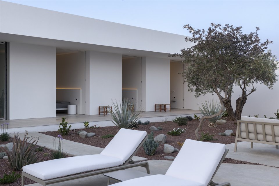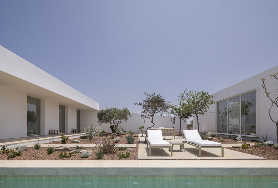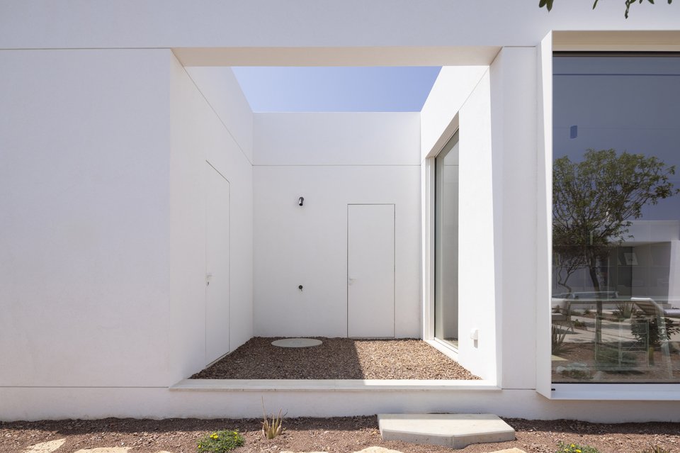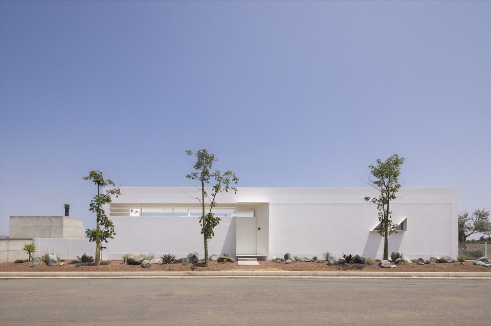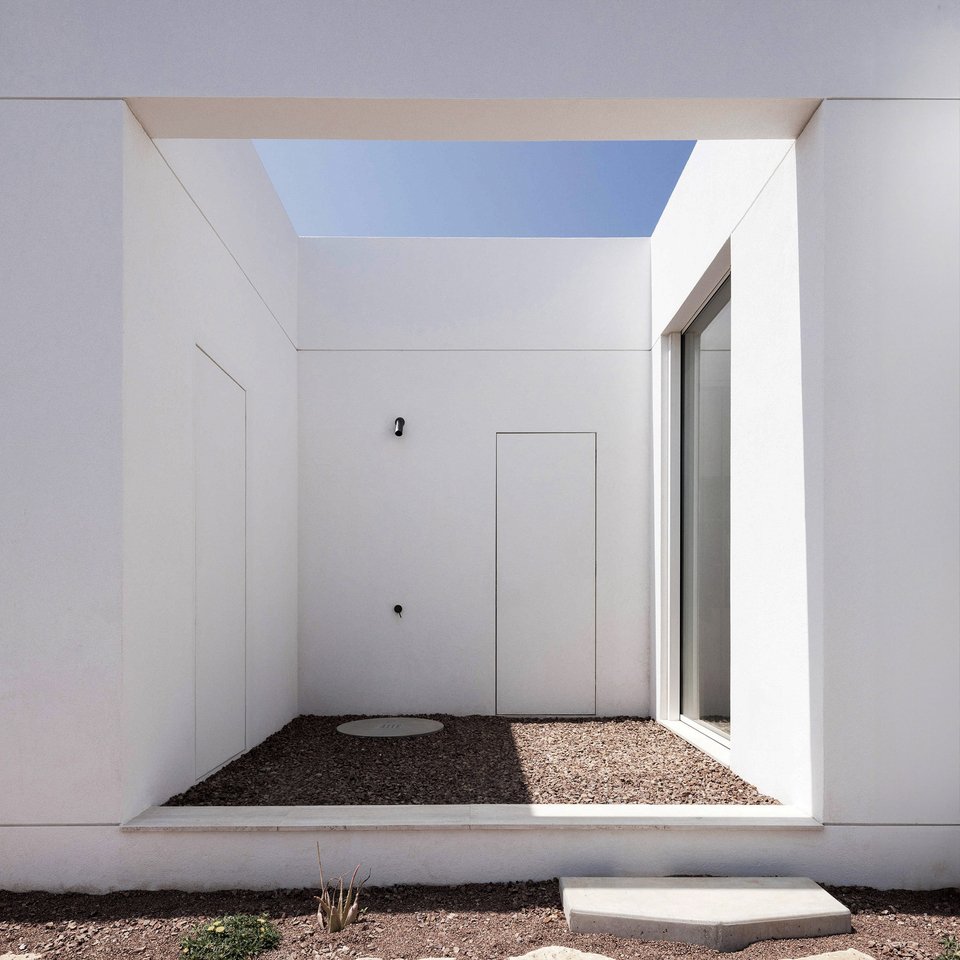 Ο σχεδιασμός είναι λιτός, μίνιμαλ, απολύτως αφαιρετικός: Δύο καθαροί ισόγειοι όγκοι, τοποθετημένοι παράλληλα, δημιουργούν ένα ενδιάμεσο αίθριο, το οποίο, όπως εξηγούν οι δημιουργοί, «λειτουργεί ως χωρικός και βιωματικός πυρήνας».