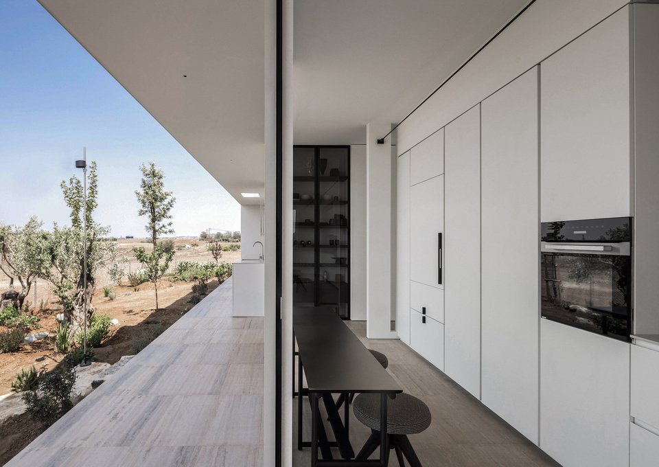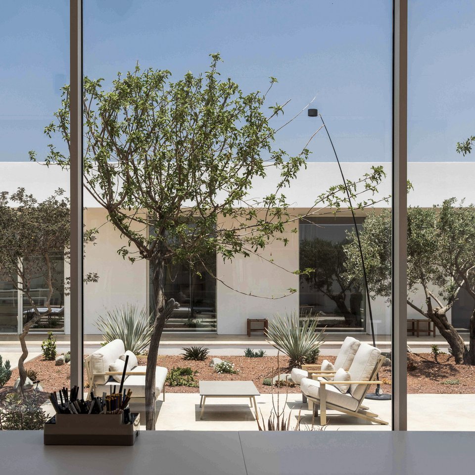 «Η γεωργική χρήση του τοπίου επιβιώνει και συνομιλεί με τη νέα δόμηση. Η κατοικία δεν εισβάλλει, αλλά ενσωματώνεται, αποδεχόμενη τον τόπο ως πρωταγωνιστή», λέει η αρχιτεκτονική ομάδα του γραφείου Μ.Ο.Β. design studio που σχεδίασε την κατοικία.