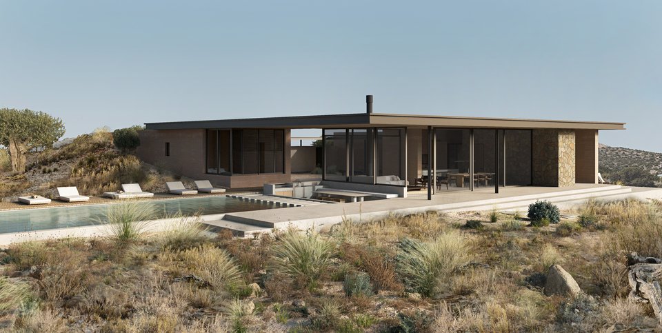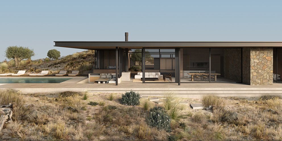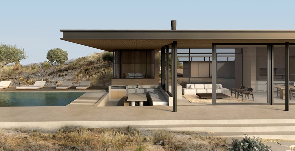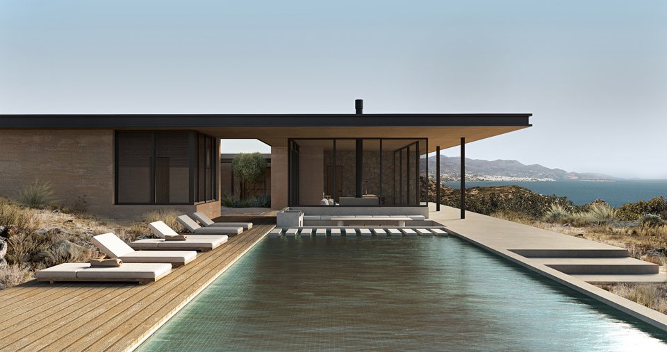 Σε λιτό καλιφορνέζικο στυλ, με κτίσμα μοντέρνων γραμμών που αναπτύσσεται σε ένα μονάχα επίπεδο πλάι στην πισίνα, ο σχεδιασμός αυτής της κατοικίας που θα χτιστεί στην παραθαλάσσια περιοχή Βαθύ, στον Άγιο Νικόλαο της Κρήτης, ενσαρκώνει την απόλυτη ανεμελιά του μεσογειακού καλοκαιριού. Με μεγάλες τζαμαρίες και με φωτεινά δωμάτια που ανοίγονται στο φυσικό περιβάλλον -μινιμαλιστικά σαλόνια που γίνονται ένα με το τοπίο, open space κουζίνες ή δροσερά υπνοδωμάτια που απολαμβάνουν τους ιριδισμούς του ήλιου στο νερό της πισίνας-, η κατοικία του αρχιτεκτονικού γραφείου Doriza Design, θυμίζει πίνακα του David Hockney.
