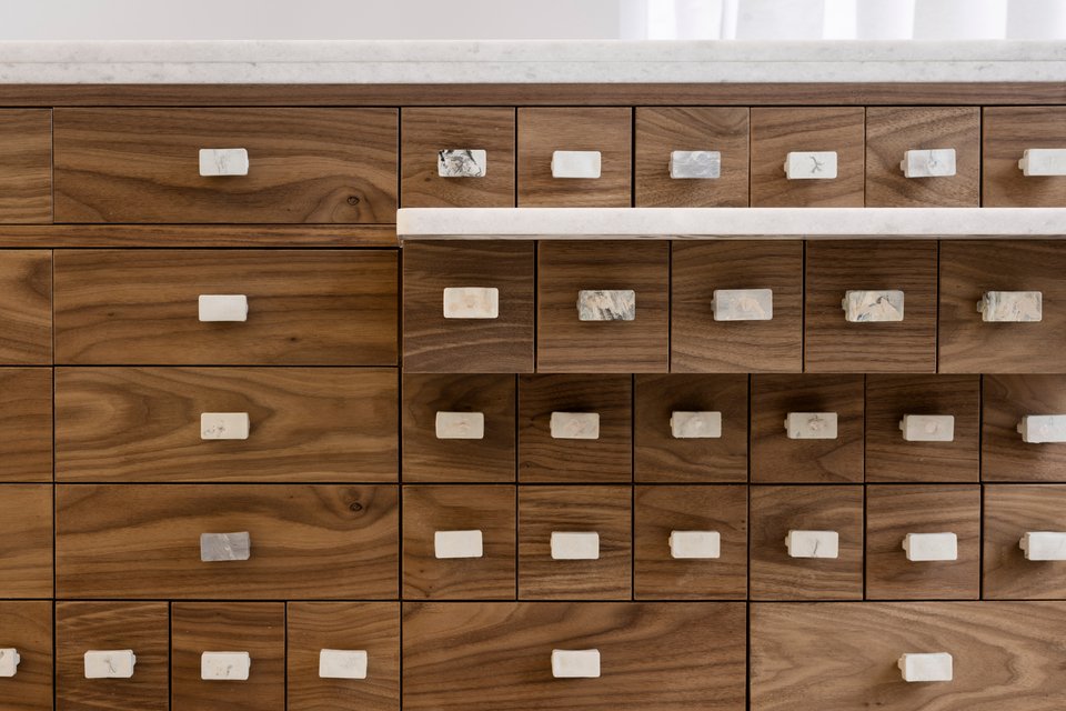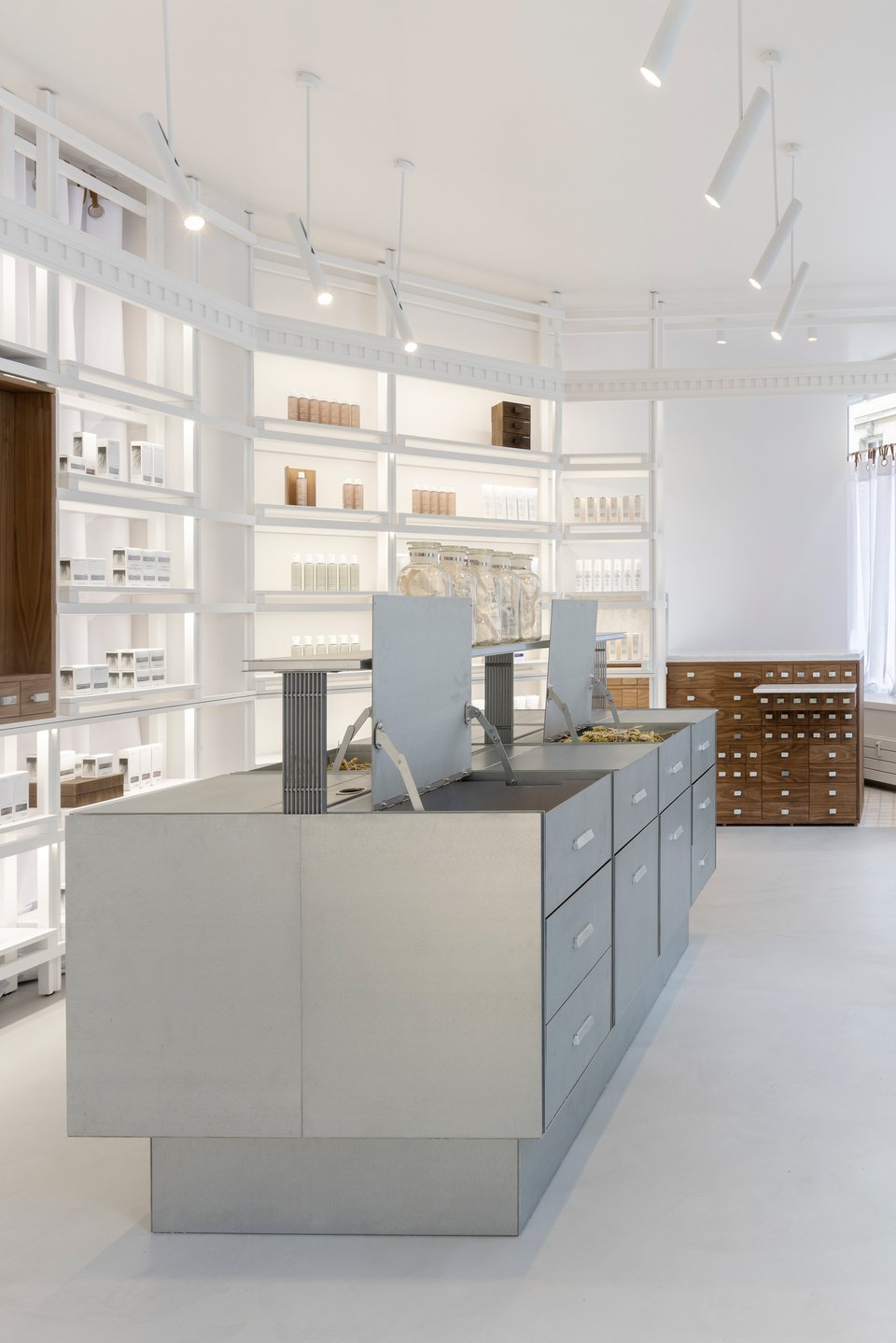 Τα υπέροχα ξύλινα συρτάρια με τα μαρμάρινα πόμολα ή ο πολυμορφικός inox πάγκος στην καρδιά του χώρου κάνουν statement ορίζοντας το παιχνίδι της εσωτερικής διακόσμησης: έναν υβριδικό χώρο ανάμεσα σε επιστημονικό εργαστήριο και πολυτελή minimal μπουτίκ.