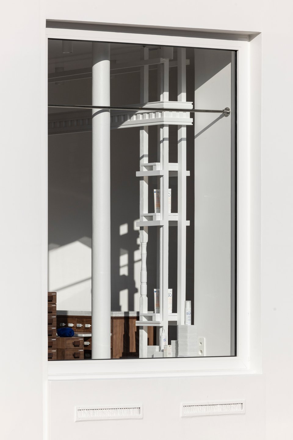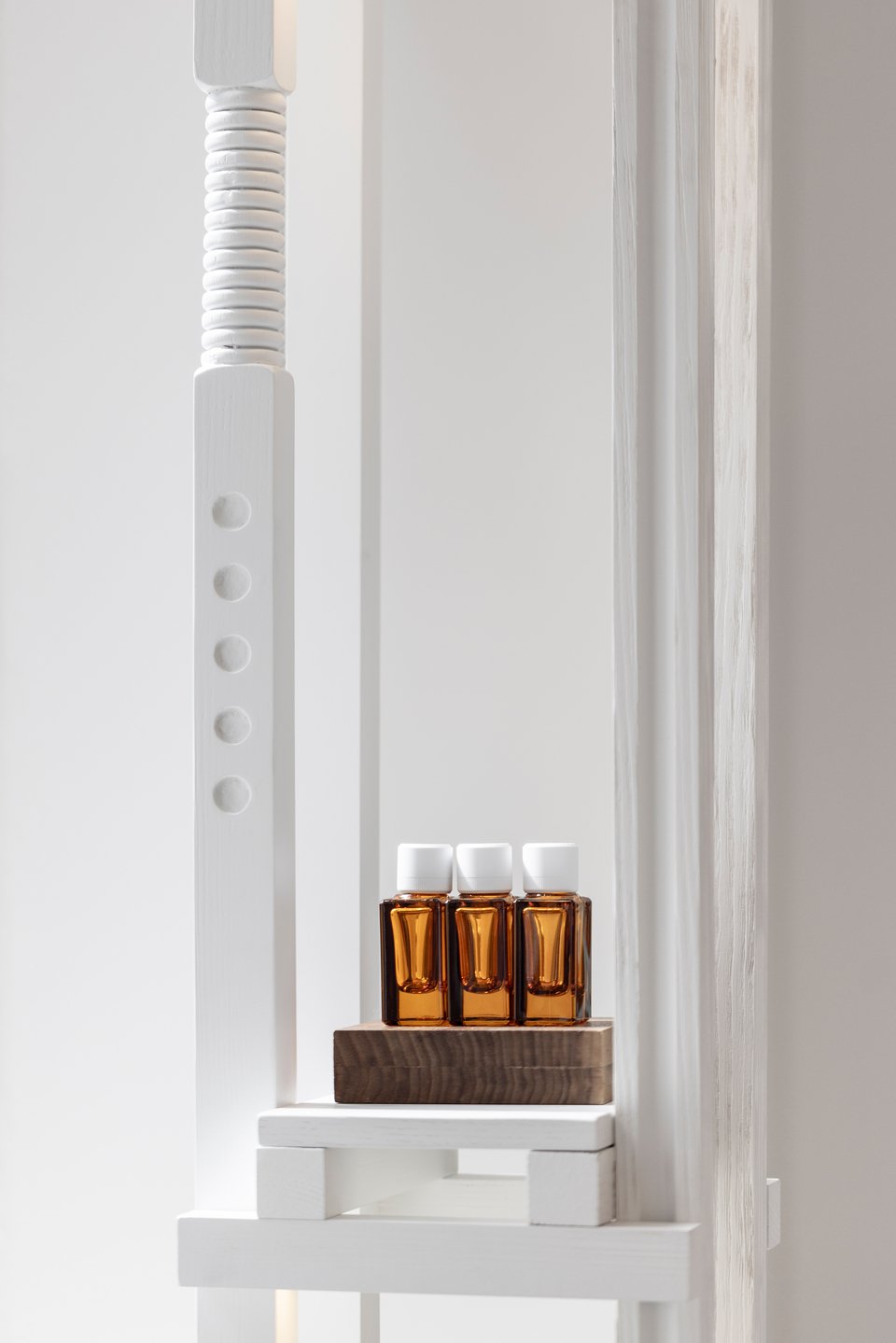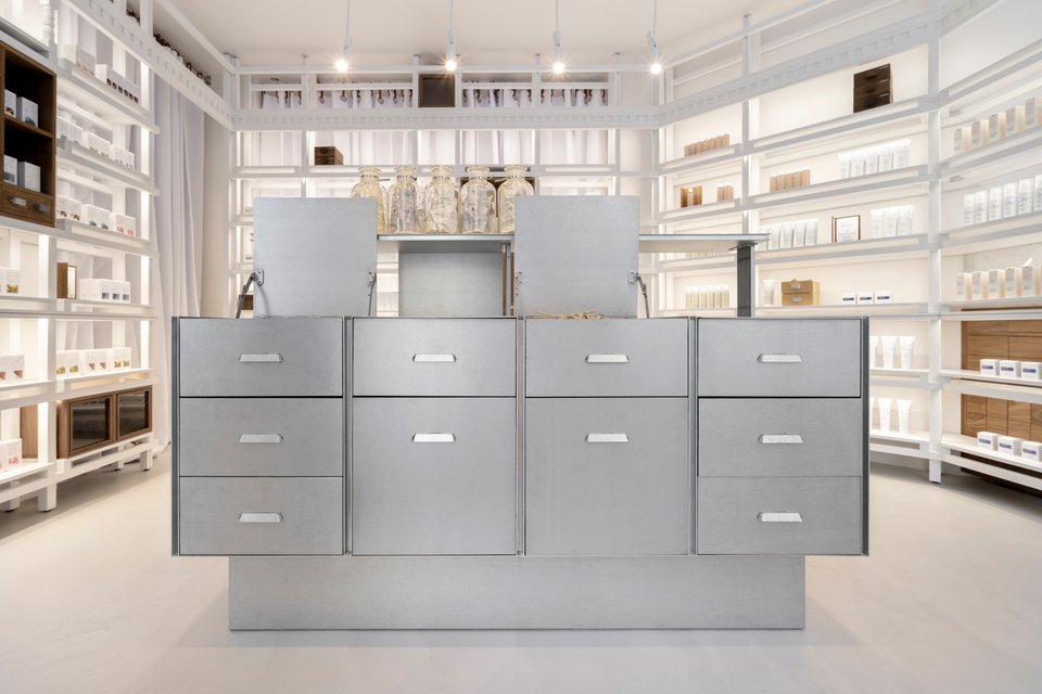 «Ως προς την επίπλωση, επεξεργαστήκαμε με ιδιαίτερη ευαισθησία τα παρακάτω στοιχεία: Πρώτον, εξελίξαμε περαιτέρω τον σχεδιασμό των ραφαριών Nissos με πιο ραδινές αναλογίες και custom ξυλογλυπτικά προφίλ που παρεμβάλλονται αποσπασματικά κατά μήκος των ορθοστατών, μια αναφορά σε διακοσμητικά στοιχεία τραπεζιών και καθισμάτων της ελληνικής παράδοσης. Δεύτερον, στον κεντρικό πάγκο, μια κατασκευή που παραπέμπει μορφολογικά σε τραπέζι εργαστηρίου αλλά διασκευάζεται λειτουργικά με τη μετατροπή των επάνω συρταριών σε ανοιγμένες προθήκες. Οι προθήκες αυτές λειτουργούν ως εκθετήρια προϊόντων και διακοσμητικών στοιχείων και προκαλούν την αλληλεπίδραση με τον πελάτη, ενώ δύνανται να μεταβληθούν ανάλογα με τις ανάγκες προβολής της εταιρείας. Τέλος, στην ντουλάπα-μπουντουάρ, ένα υβριδικό έπιπλο σχεδιασμένο ειδικά για τις ανάγκες του make-up. Μια δίφυλλη ξύλινη ντουλάπα με πλεγμένες τάβλες στην πλάτη τοποθετείται "ανοιγμένη" στη μία πλευρά του καταστήματος. Στο εσωτερικό της τοποθετούνται συρτάρια και καθρέφτες από τη μία πλευρά, και από την άλλη ένα ντουλάπι πλήρως επενδεδυμένο με καθρέφτες για τα προϊόντα του make-up. Οι πολλαπλές αντανακλάσεις διανοίγουν τον χώρο και φέρνουν τον καταναλωτή στο κέντρο της εμπειρίας αγοράς», περιγράφει η ομάδα σχεδιασμού του αρχιτεκτονικού γραφείου The Trail Practice.