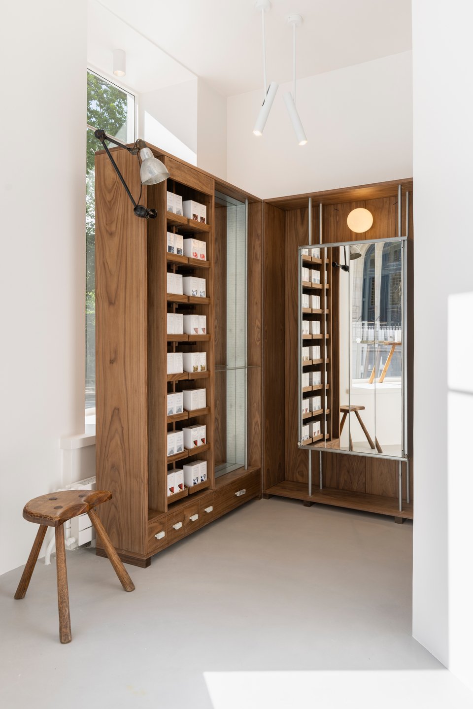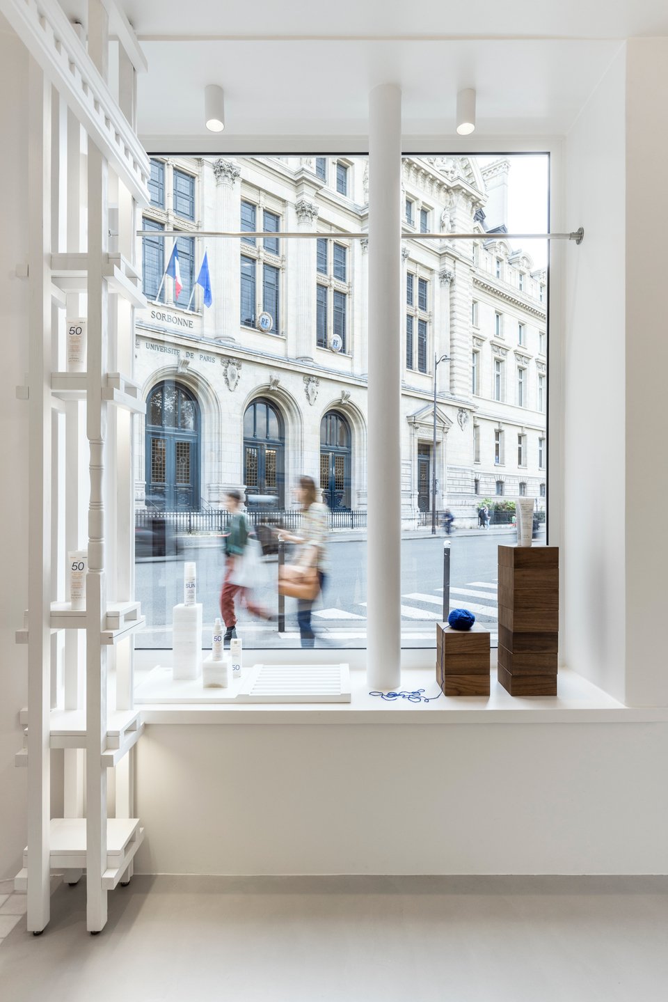 «Η περιορισμένη έκταση του χώρου και το παραγωγικό σχήμα της κάτοψης μας οδήγησαν στον ορισμό τεσσάρων ορθοκανονικών αξόνων για τη βέλτιστη οργάνωση των κινήσεων και των επιμέρους περιοχών του καταστήματος. Τα μεγάλα ανοίγματα της όψης αντισταθμίζουν την έλλειψη χώρου, επιτρέποντας την άπλετη διάχυση του φυσικού φωτός στο εσωτερικό και προκαλώντας μια διαρκή συνδιαλλαγή με το παριζιάνικο αστικό τοπίο εντός του καταστήματος: με το Πανεπιστήμιο της Σορβόννης, το πάρκο Paul Painlevé, τη ζωηρή κυκλοφορία της Rue des Écoles. Το λευκό επικρατεί εντός και εκτός του καταστήματος. Η απόφαση για μια πιο μονοσήμαντη αντιμετώπιση ως προς τη χρωματική παλέτα -κυρίως του εσωτερικού- έχει ωριμάσει στα τελευταία έργα της εταιρείας, με σκοπό τη δημιουργία ενός πιο “καθαρού” και σύγχρονου καμβά για την ανάδειξη των προϊόντων. Οι ποικίλες υλικότητες των λευκών στοιχείων στο εσωτερικό (μάρμαρο, κουρτίνα, ξύλινες κατασκευές) διαταράσσουν ανεπαίσθητα αυτή τη μονοσημαντότητα. Ξεχωρίζουν, επίσης, οι κατασκευές από καρυδιά ως stand-out points, καθώς και τα πιο premium στοιχεία του έργου από γαλβανιζέ λαμαρίνα», εξηγούν οι αρχιτέκτονες.