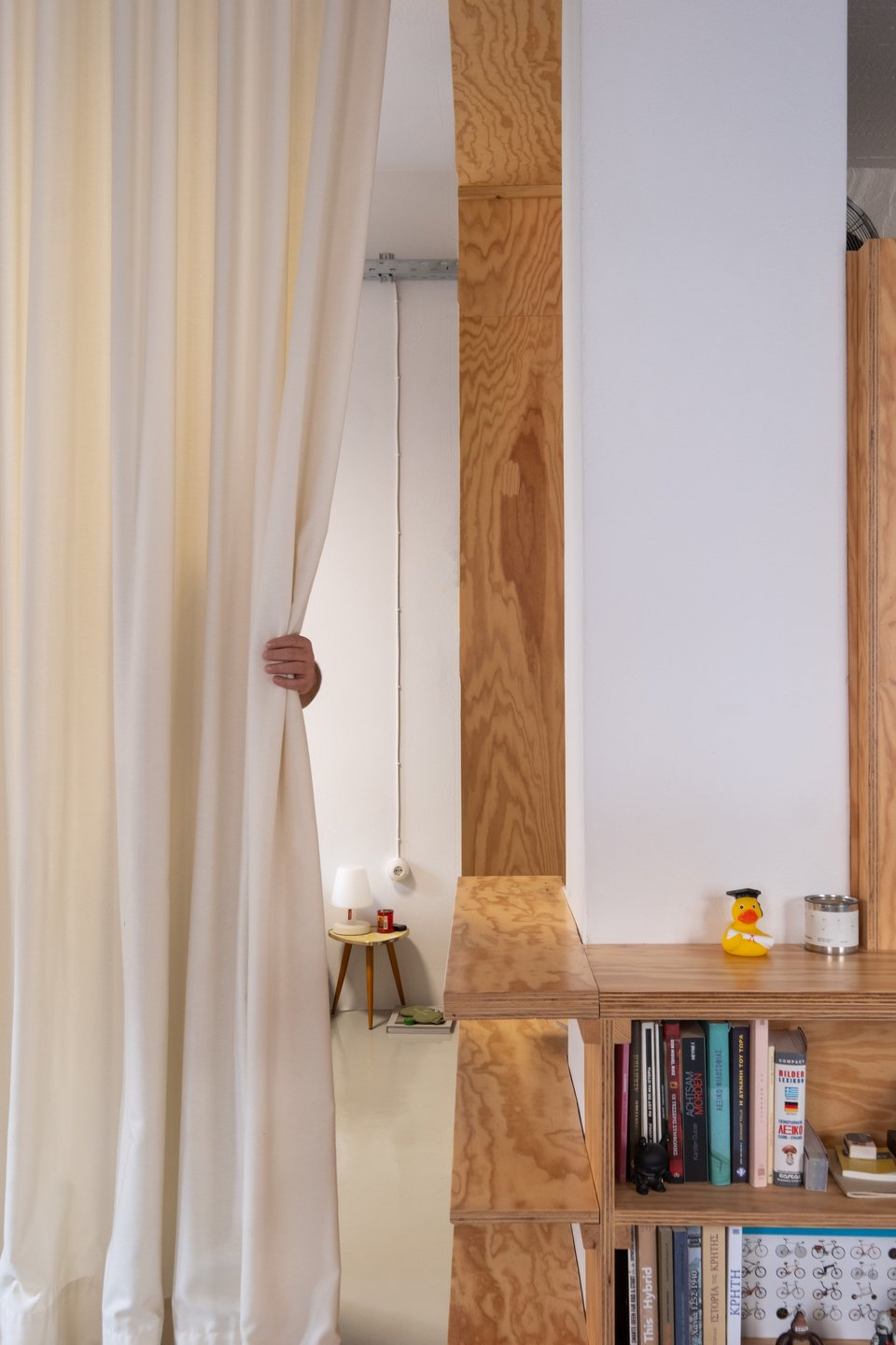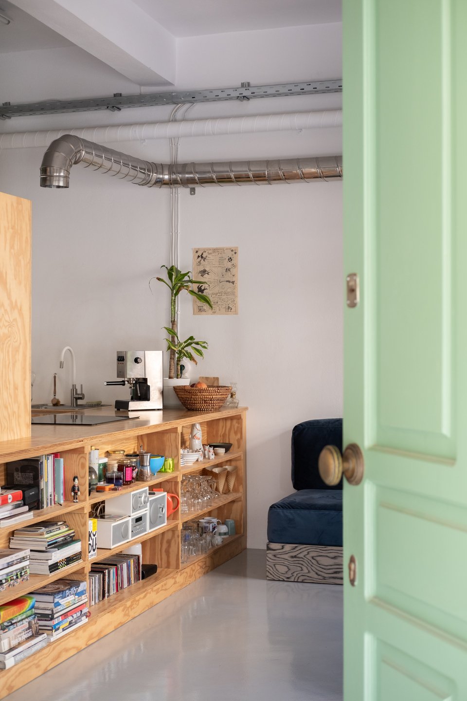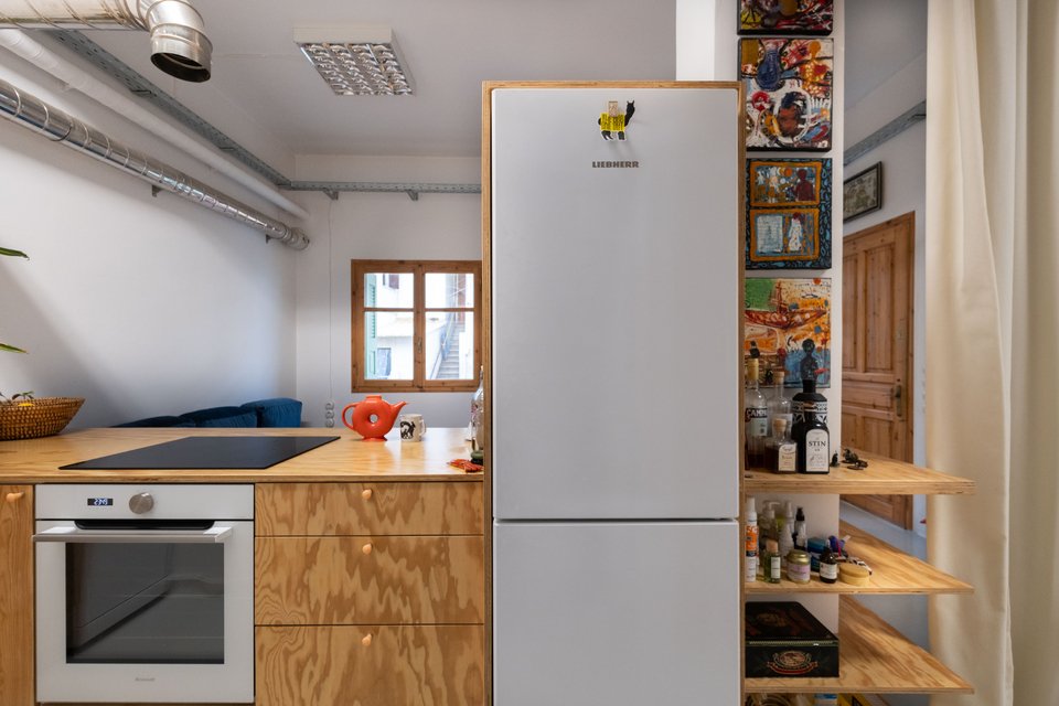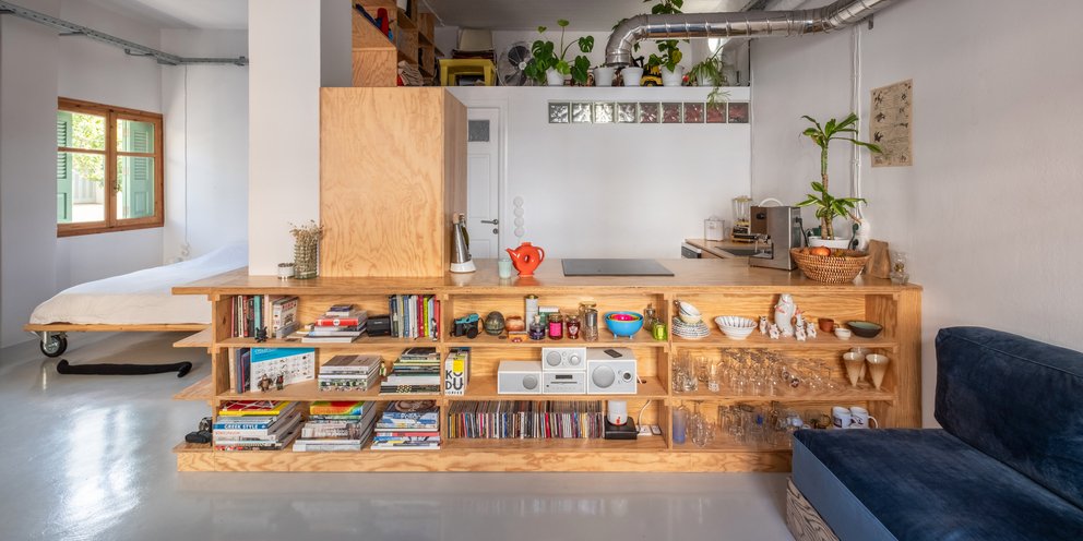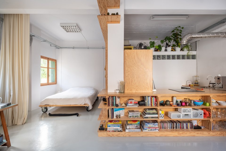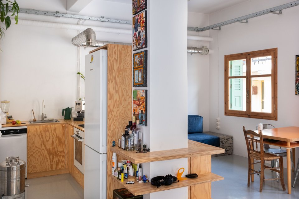 «Μια νέα ανοιχτή διαρρύθμιση επιτεύχθηκε κατεδαφίζοντας τους τοίχους του υπνοδωματίου, δημιουργώντας έτσι ένα πιο ευρύχωρο εσωτερικό. Το κεντρικό στοιχείο του διαμερίσματος είναι το διαχωριστικό-έπιπλο από κόντρα πλακέ πεύκου, που λειτουργεί ως κουζίνα, βιβλιοθήκη και ντουλάπα-αποθήκη, ενώ ταυτόχρονα χωρίζει την κουζίνα και το μπάνιο από το υπόλοιπο διαμέρισμα. Αυτή η ιδέα επιτρέπει στον χώρο να αναπνέει και να εισέρχεται περισσότερο φως σε κάθε γωνιά του ισόγειου σπιτιού, καθιστώντας το ως έναν ιδανικό χώρο για εργασία και διαβίωση. Τα υαλότουβλα στο μπάνιο και ο ανοιχτός χώρος αποθήκευσης από πάνω, προσθέτουν μια επιπλέον αίσθηση ανοιχτότητας. Τα εκτεθειμένα μηχανικά και ηλεκτρικά εξαρτήματα του χώρου εξισορροπούνται με τα ξύλινα στοιχεία και τα έντονα έπιπλα και αντικείμενα, δημιουργώντας έναν σύγχρονο και φιλόξενο χώρο», προσθέτει ο Νίκος Κουκλάκης.