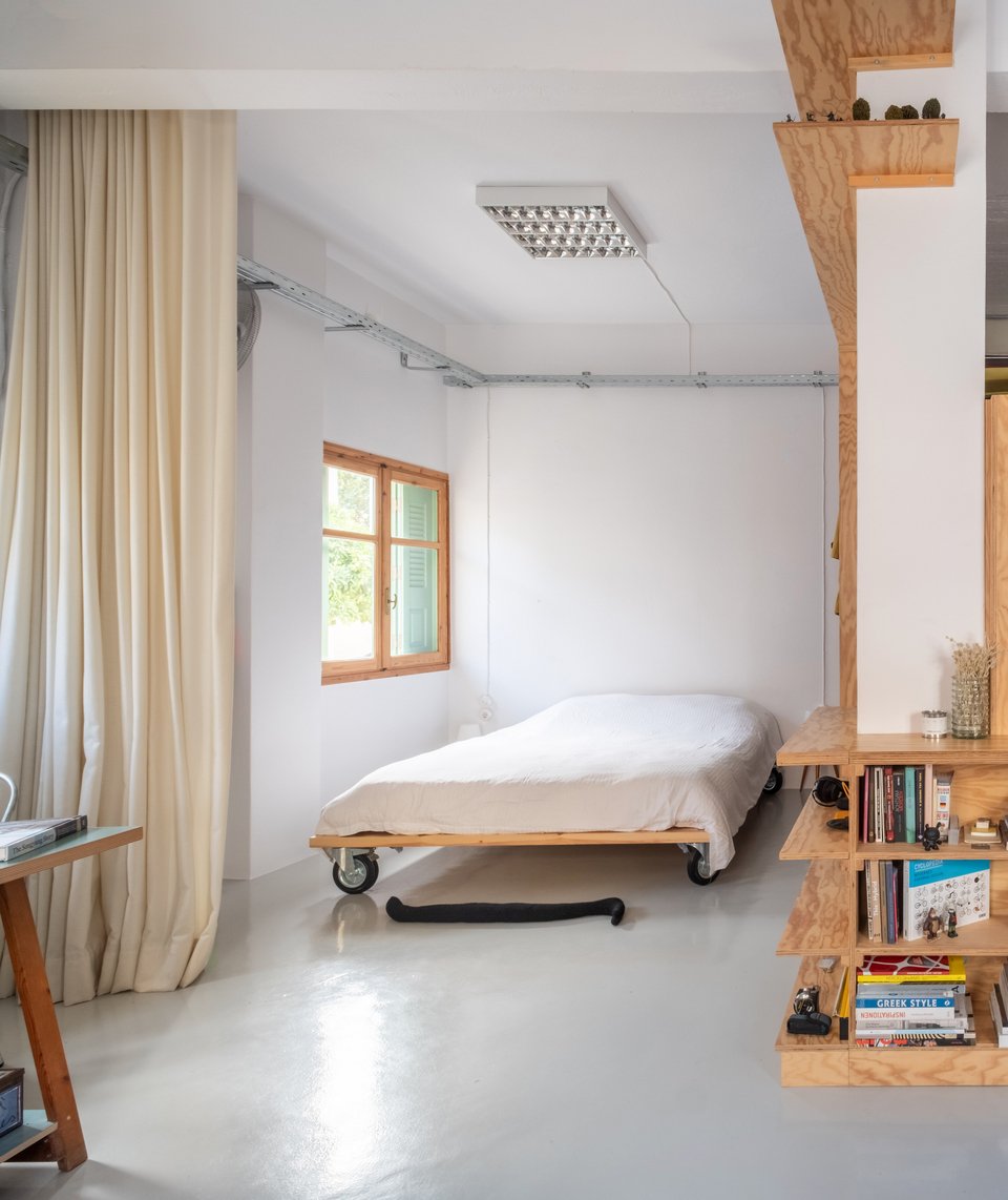 Το ωραίο και απλό τροχήλατο κρεβάτι απομονώνεται με μια κουρτίνα από τον υπόλοιπο ενιαίο χώρο.