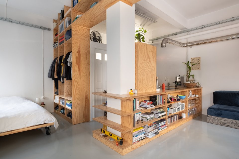 Το βασικό εύρημα που χρησιμοποίησε ο αρχιτέκτονας είναι η τοποθέτηση στην καρδιά του μικρού στούντιο μιας πολλαπλών χρήσεων ξύλινης κατασκευής που λειτουργεί ταυτόχρονα ως πάγκος μαγειρικής, βιβλιοθήκη, έπιπλο αποθήκευσης, πάσο, διαχωριστικό, ραφιέρα για διακοσμητικά, χρηστικά και κάθε άλλου είδους αντικείμενα.