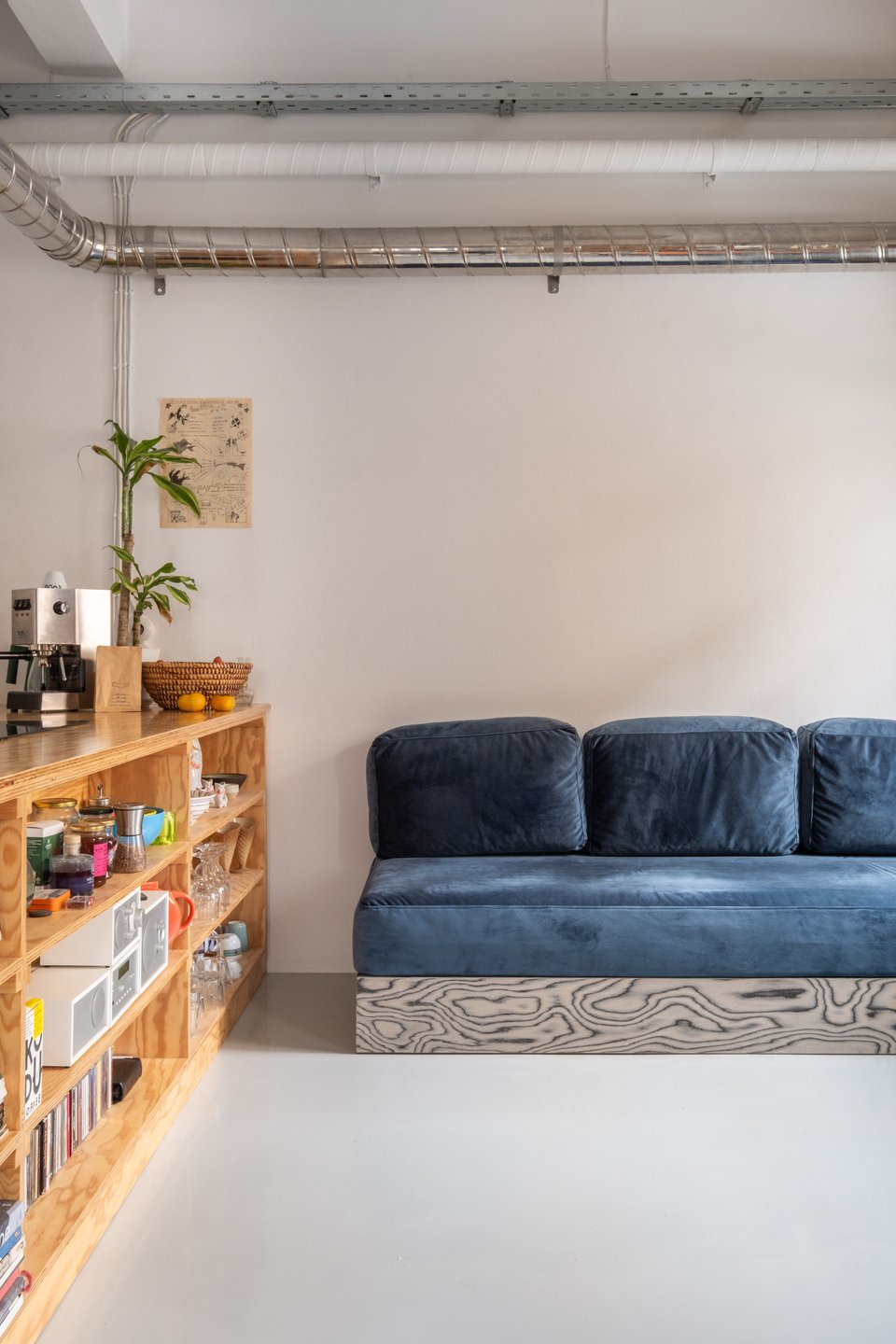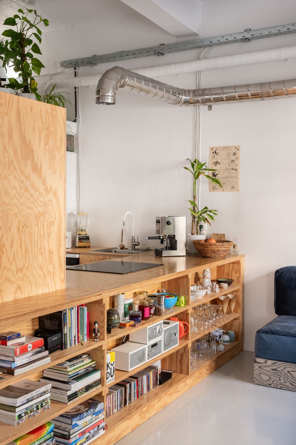 Στην ίδια λογική, μιας καθημερινότητας που είναι ανοιχτή, εξωστρεφής και δεν έχει τίποτα να κρύψει, όλα είναι τοποθετημένα σε ανοιχτά ράφια: ρούχα, παπούτσια, ποτήρια, εργαλεία της δουλειάς, σκεύη μαγειρικής, φωτογραφικές μηχανές, καλλυντικά, ποτά - όλα συνυπάρχουν σε κοινή θέα με τα λευκώματα και τα βιβλία, με τα CD μουσικής και με τα διακοσμητικά αντικείμενα.