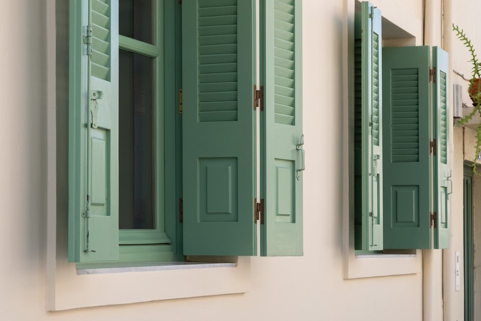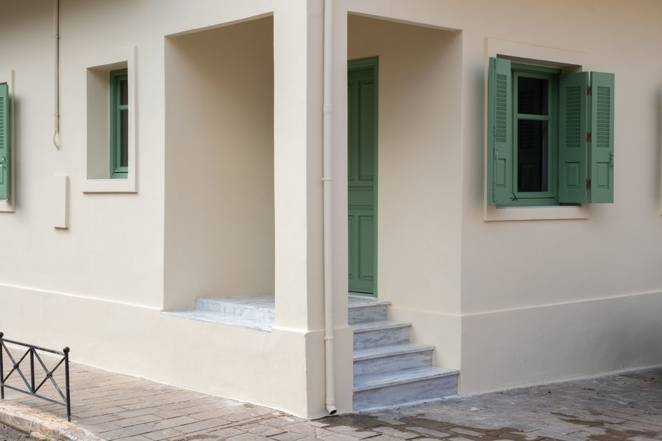 Το εξωτερικό ανανεώθηκε με μια ανοιχτή μπεζ απόχρωση και τα παλιά κουφώματα διατηρήθηκαν και βάφτηκαν με απαλό πράσινο στο εξωτερικό, δημιουργώντας μια αντίθεση με τα ξύλινα στοιχεία στο εσωτερικό του σπιτιού.