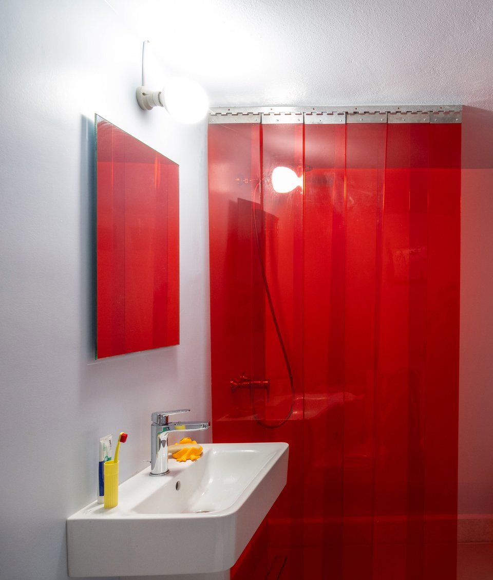 Η πρωτότυπη κουρτίνα της ντουζιέρας από κόκκινα διάφανα συρόμενα φύλλα δίνει ποπ χαρακτήρα στο μικρό μπάνιο.