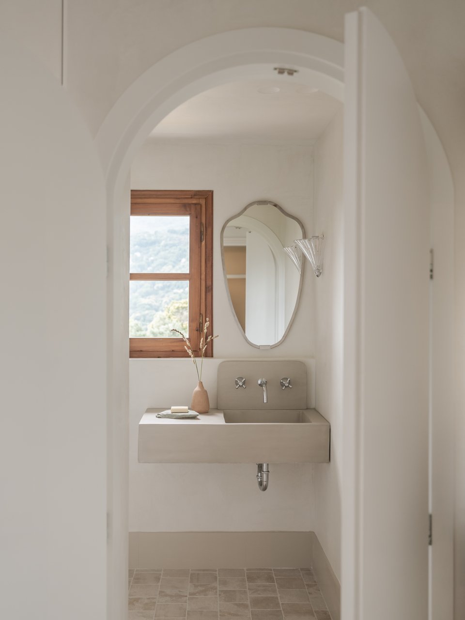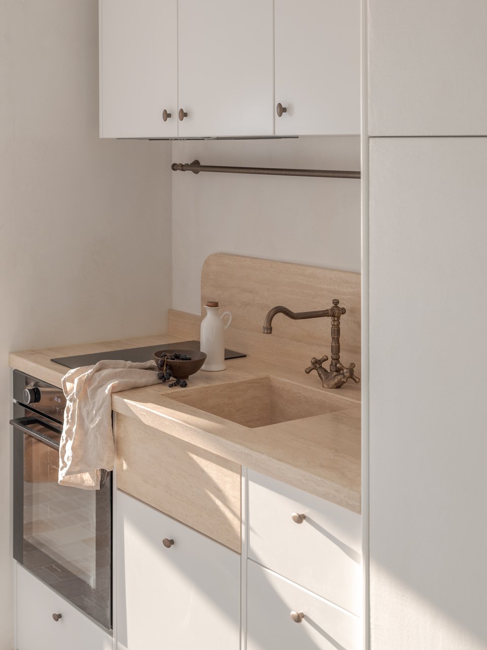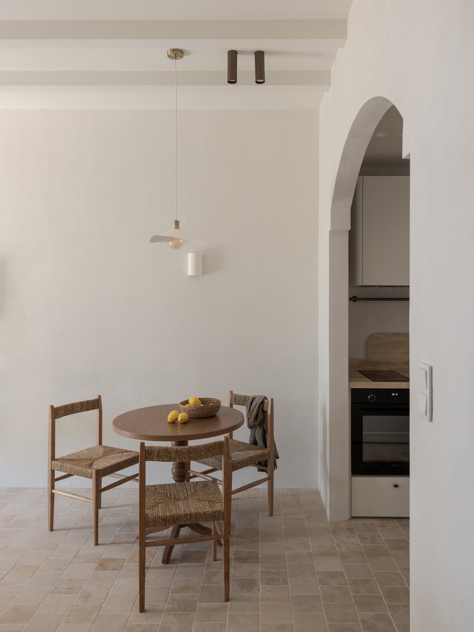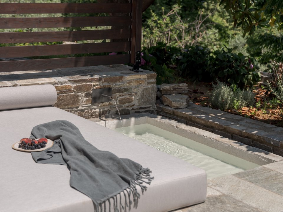 «Ο σχεδιασμός βασίζεται στη χρήση φυσικών υλικών που αναδεικνύουν την παραδοσιακή αρχιτεκτονική του Πηλίου. Ένα από τα πιο ξεχωριστά χαρακτηριστικά της ανακαίνισης είναι το δάπεδο από φυσική πέτρα, το οποίο εκτείνεται σε όλους τους χώρους, τονίζοντας την αυθεντικότητα και εξασφαλίζοντας διαχρονική ανθεκτικότητα. Στις οροφές, οι καμπύλες φόρμες και τα λευκά ξύλινα δοκάρια ενισχύουν τη φωτεινότητα και την αίσθηση ευρυχωρίας. Οι παραδοσιακές διπλές ξύλινες πόρτες, οι καμπύλες διπλές πόρτες στα μπάνια και οι χειροποίητοι νιπτήρες από γυαλισμένο σκυρόδεμα προσθέτουν μοναδικότητα και μια αίσθηση δεξιοτεχνίας. Ιδιαίτερη προσοχή δόθηκε, επίσης, στους πάγκους από μάρμαρο τραβερτίνη, οι οποίοι αποτελούν ένα εντυπωσιακό αισθητικό και λειτουργικό στοιχείο των χώρων», εξηγούν οι αρχιτέκτονες.